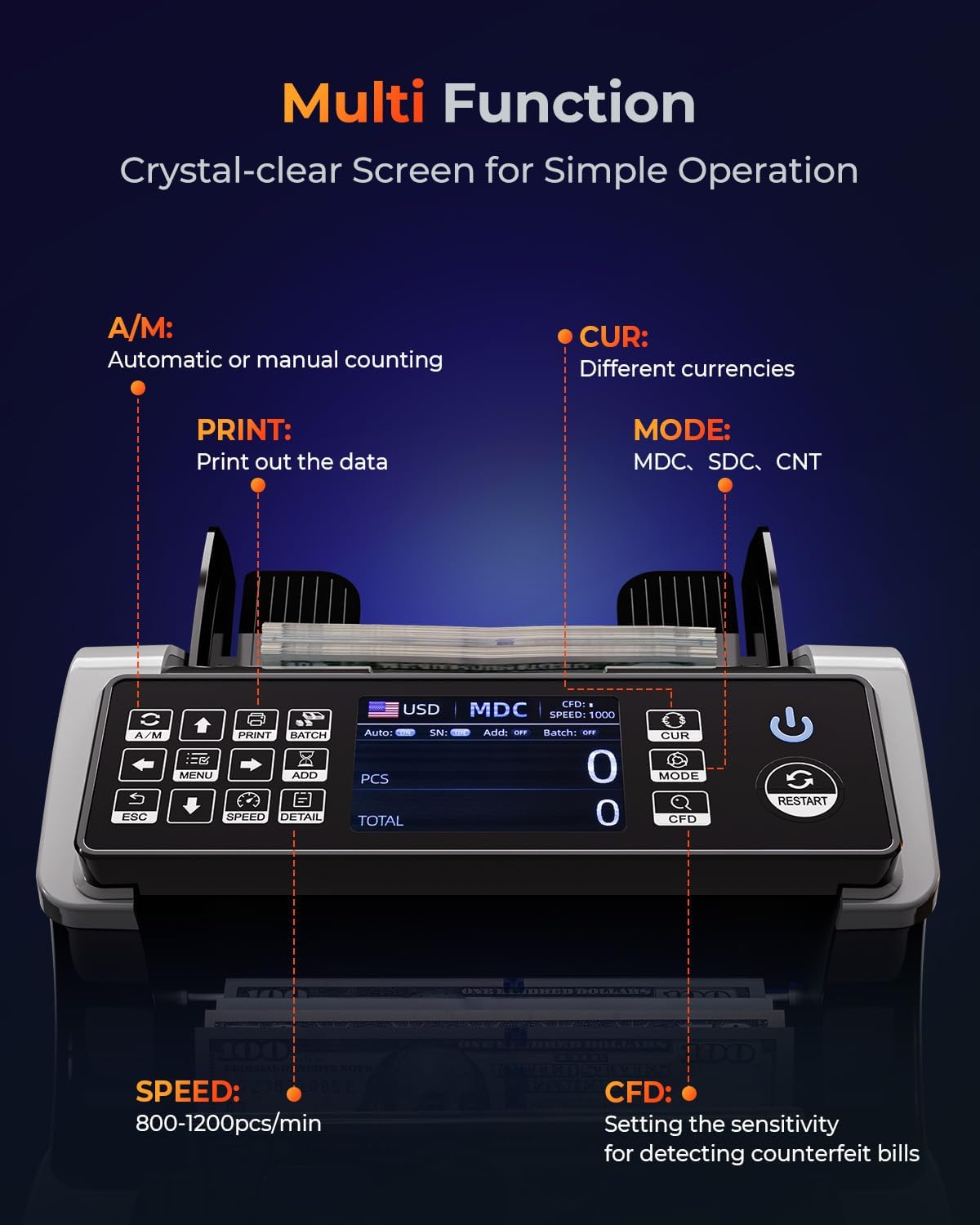 - Perfect For Business: Money counter machine mixed denomination boosts your efficiency on cash counting job with the following functions: Mixed denomination, manual sorting based on first denomination or currency, ADD, BATCH, ADD & BATCH, Auto/Manual counting, PRINT(Need MUNBYN printer). Ideal for grocery stores or casinos to deal with heavy cash-counting jobs