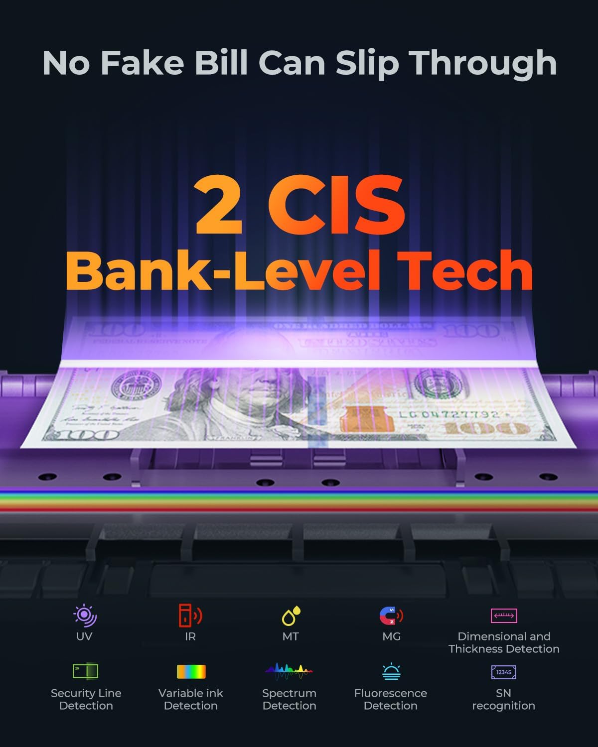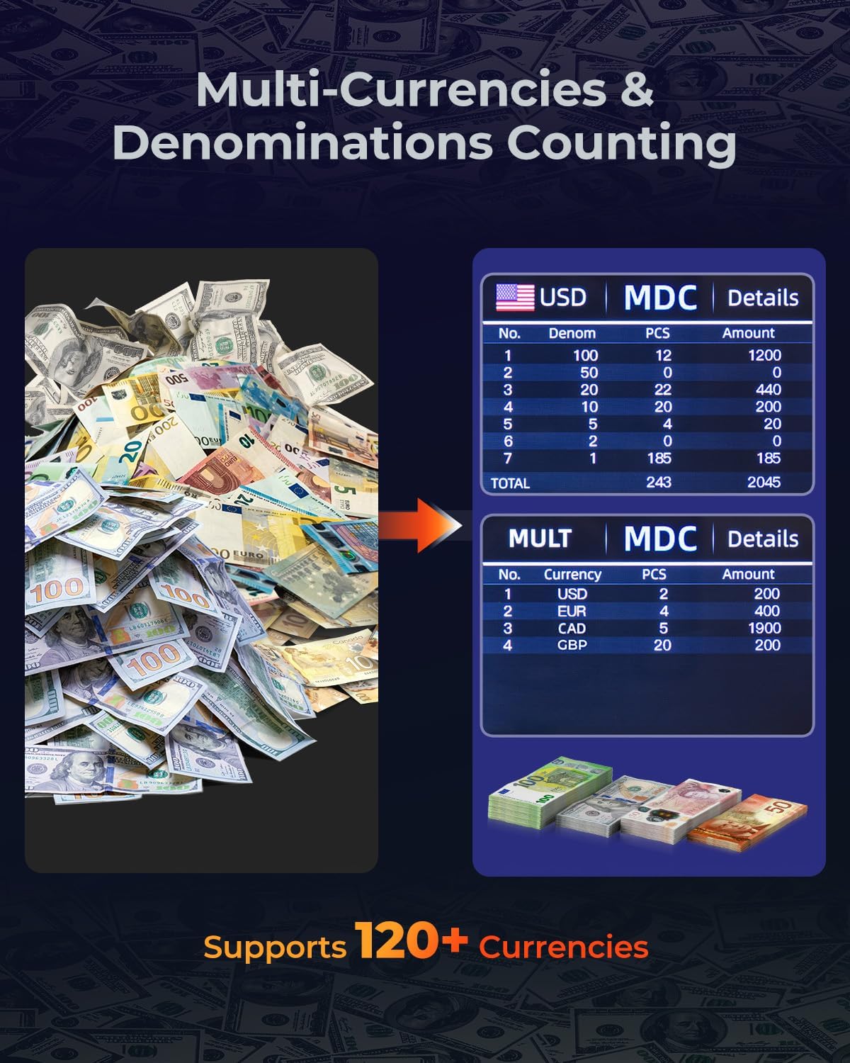 - Business Guard: The mixed denomination currency counter has 11 counterfeit detection methods to ensure your bills’ authenticity. Cash counter mixed denomination saves your effort and keeps you peace of mind when you deal with heavy cash counting work. 2CIS, UV, MG, IR, MT, and SN Recognition, effective against Superdollar.[Privacy Protection] For your privacy and security, there is no information about the cash counting machine on the outer box, ensuring the safety of your cash business