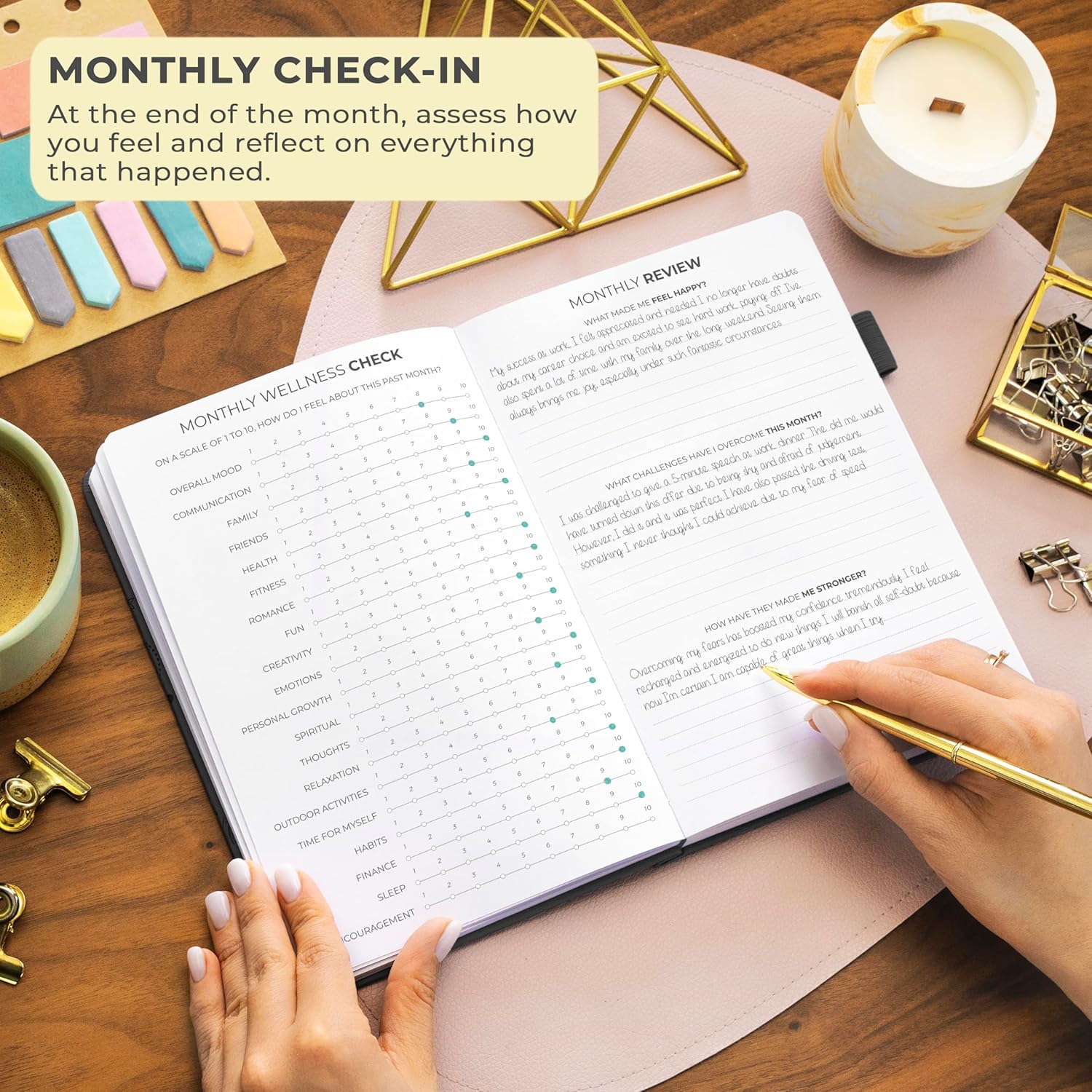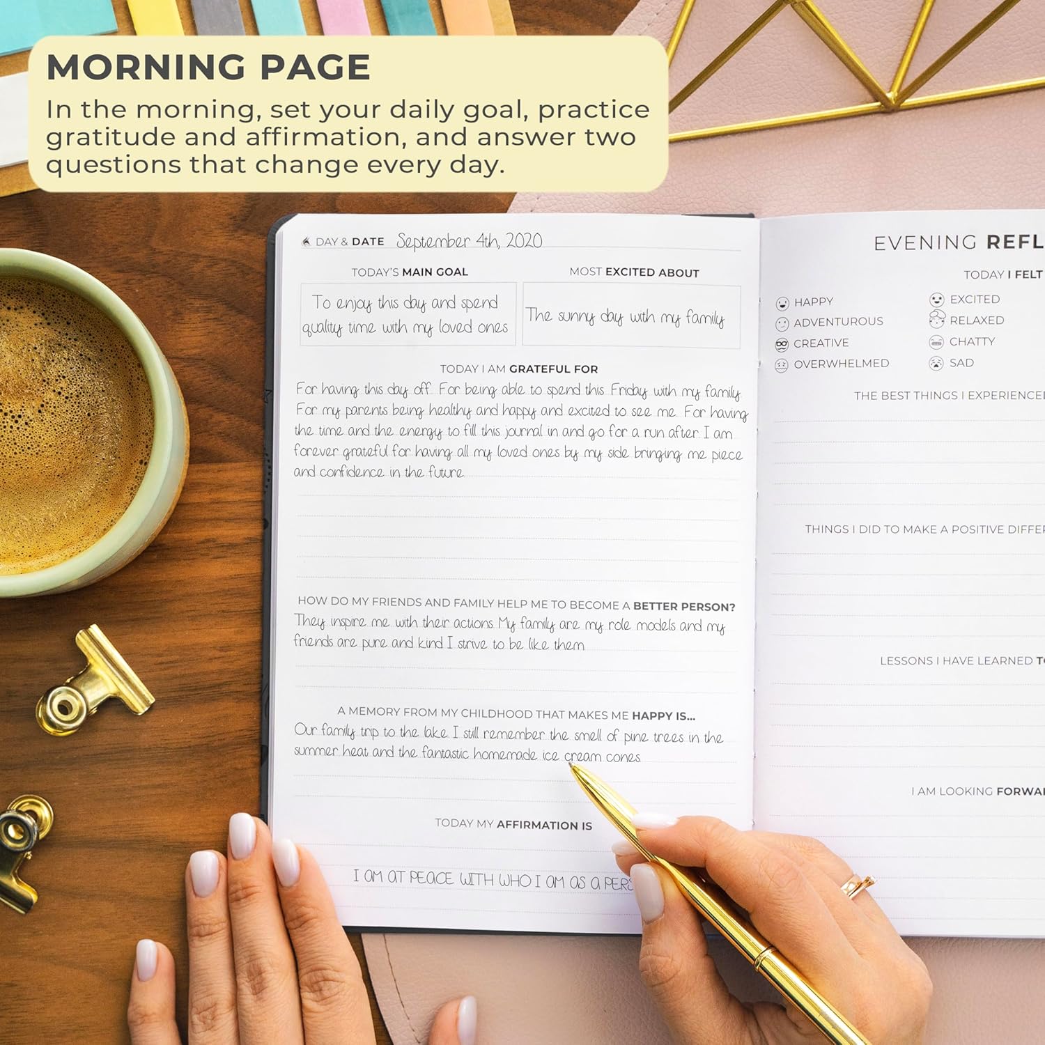 - STIMULATE GROWTH WITH DAILY REFLECTION: Reflect on your day and foster self-awareness with evening reflection pages and regular weekly exercises.