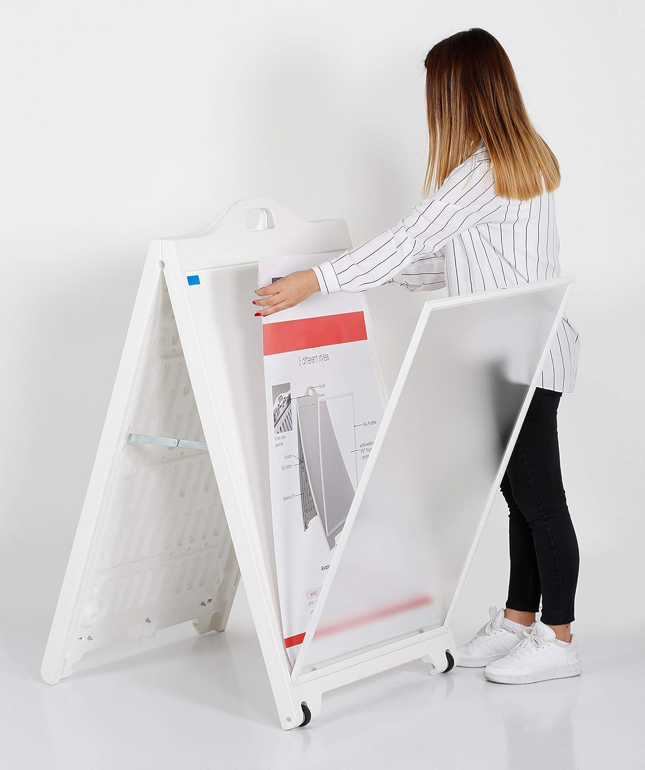 - HEAVY-DUTY OUTDOOR ADVERTISING DISPLAY: Our genuine patented A-Board (PATENT PCT/EP2017/052765) folding and portable design, equipped with wheels for easy transport. Locking metal scissors prevent your A-Frame from over-extending. Protective cover helps you keep your signage looking clean and professional at all times. Protective cover latches shut while adhesive strips hold your signage in place. Protects your poster from dirt and damage.