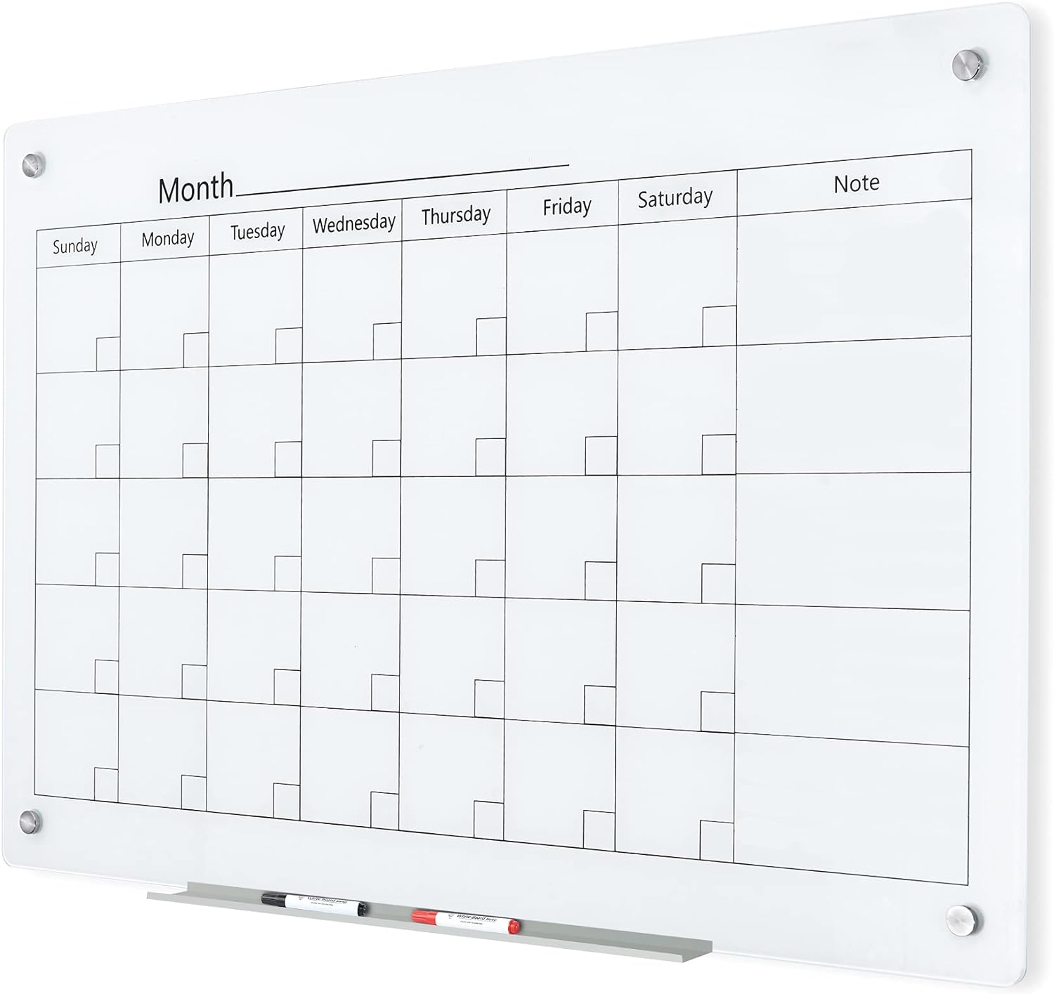 J&J worldwide Magnetic Whiteboard Calendar, 3' x 2' Glass Wall Calendar Dry Erase Board Monthly Planner for Home, School, Office, Frameless, with Markers, Marker Tray, Eraser, Magnets, 35 x 23 Inches