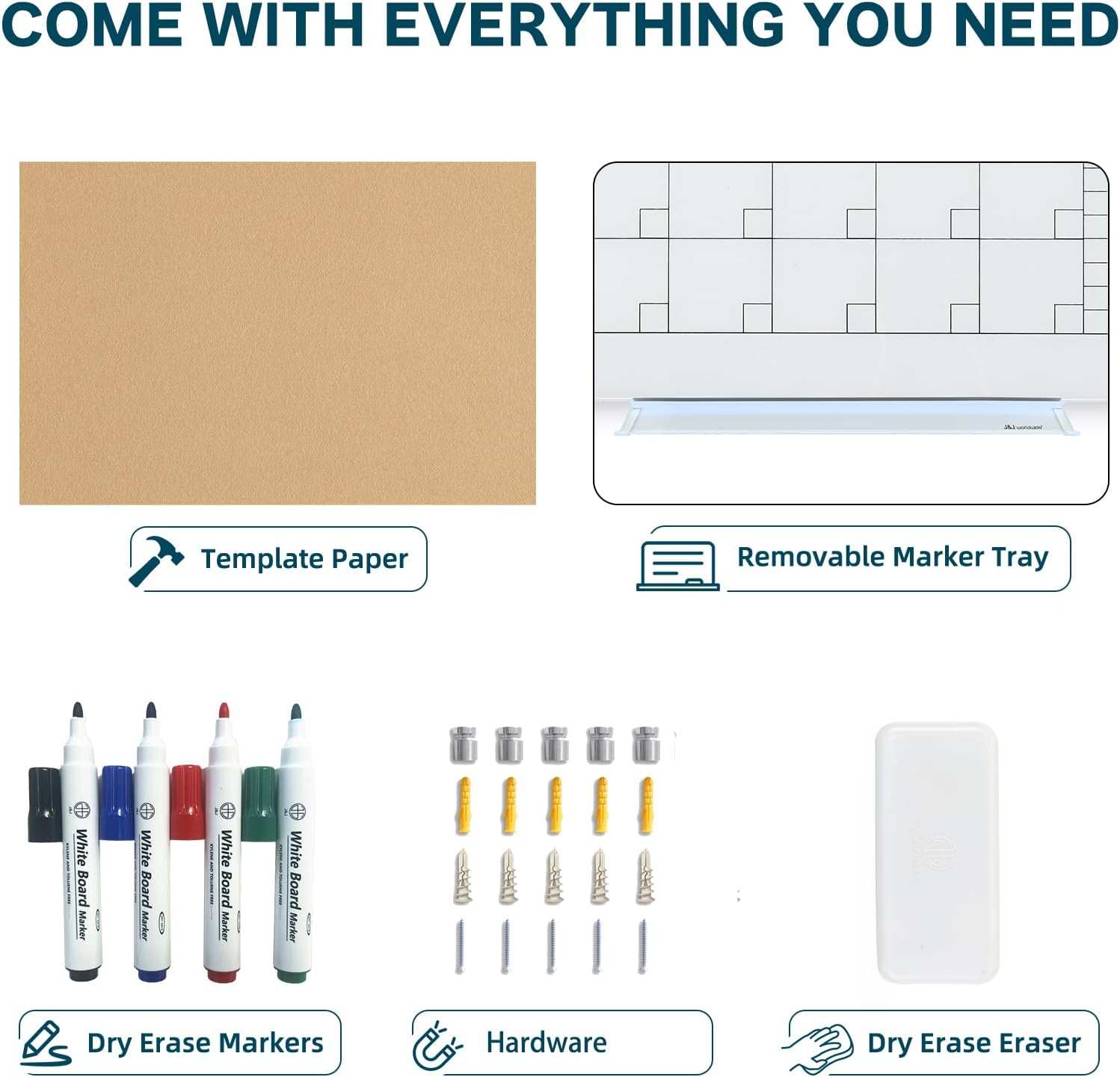 - 【Accessories Included】 The package includes 4 dry erase markers, 4 magnets and 1 glass whiteboard eraser, 1 removable aluminium marker tray, and 1 template paper for mounting. One-stop shopping. It's a great gift idea for your workmate, boss or spouse which can enhance the office/ house wall.