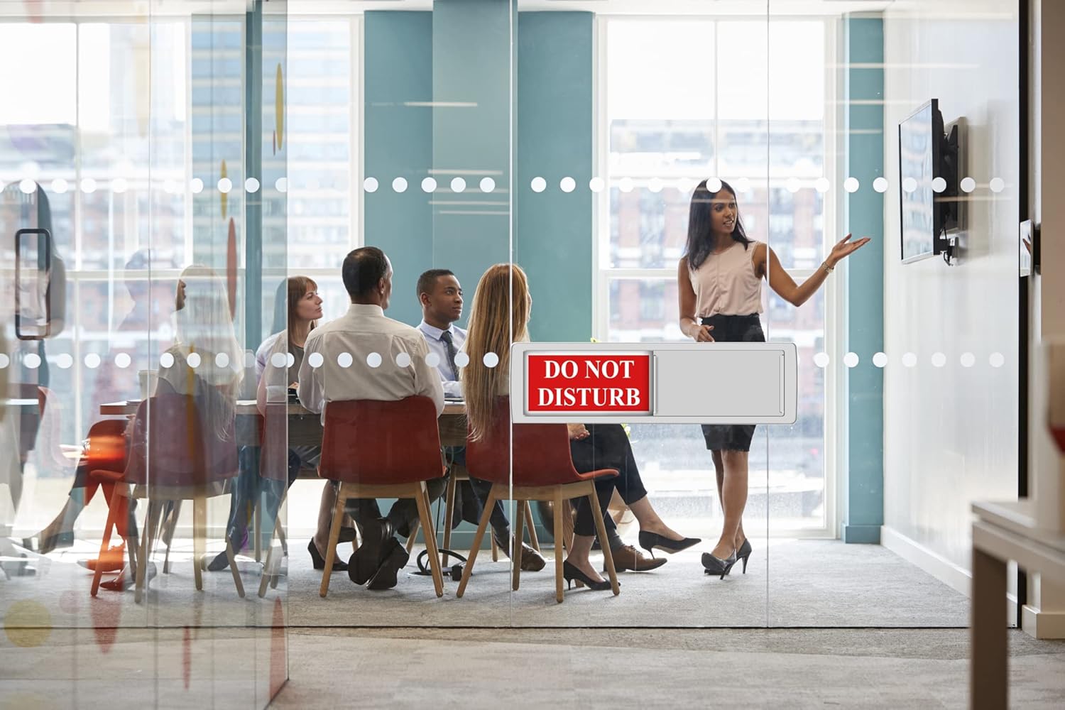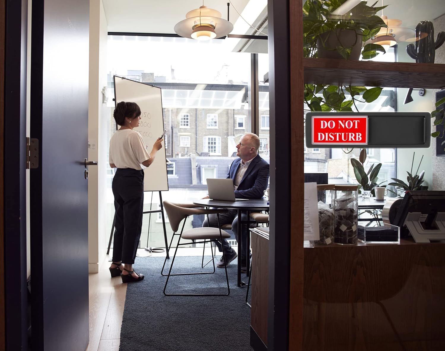 - RESPECT YOUR TIME AND SPACE: Green side is WELCOME PLEASE KNOCK, red side is DO NOT DISTURB. This privacy sign can display the availability of any office, conference room or employee with our (7" length) slider sign (2" high) with a top sliding plate to reveal one message at a time to inform your office or home whether rooms are vacant or occupied.