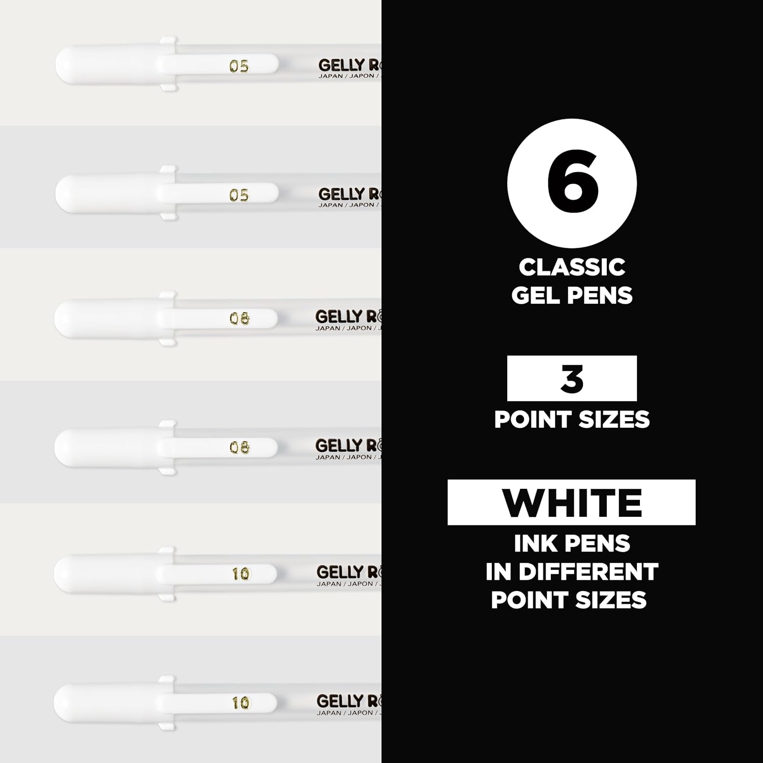 SAKURA Gelly Roll Gel Pens - Fine, Medium & Bold Tip Ink Pens for Journaling, Art, or Drawing - Classic White Ink - 05/08/10 Assorted Tip Sizes - 6 Pack