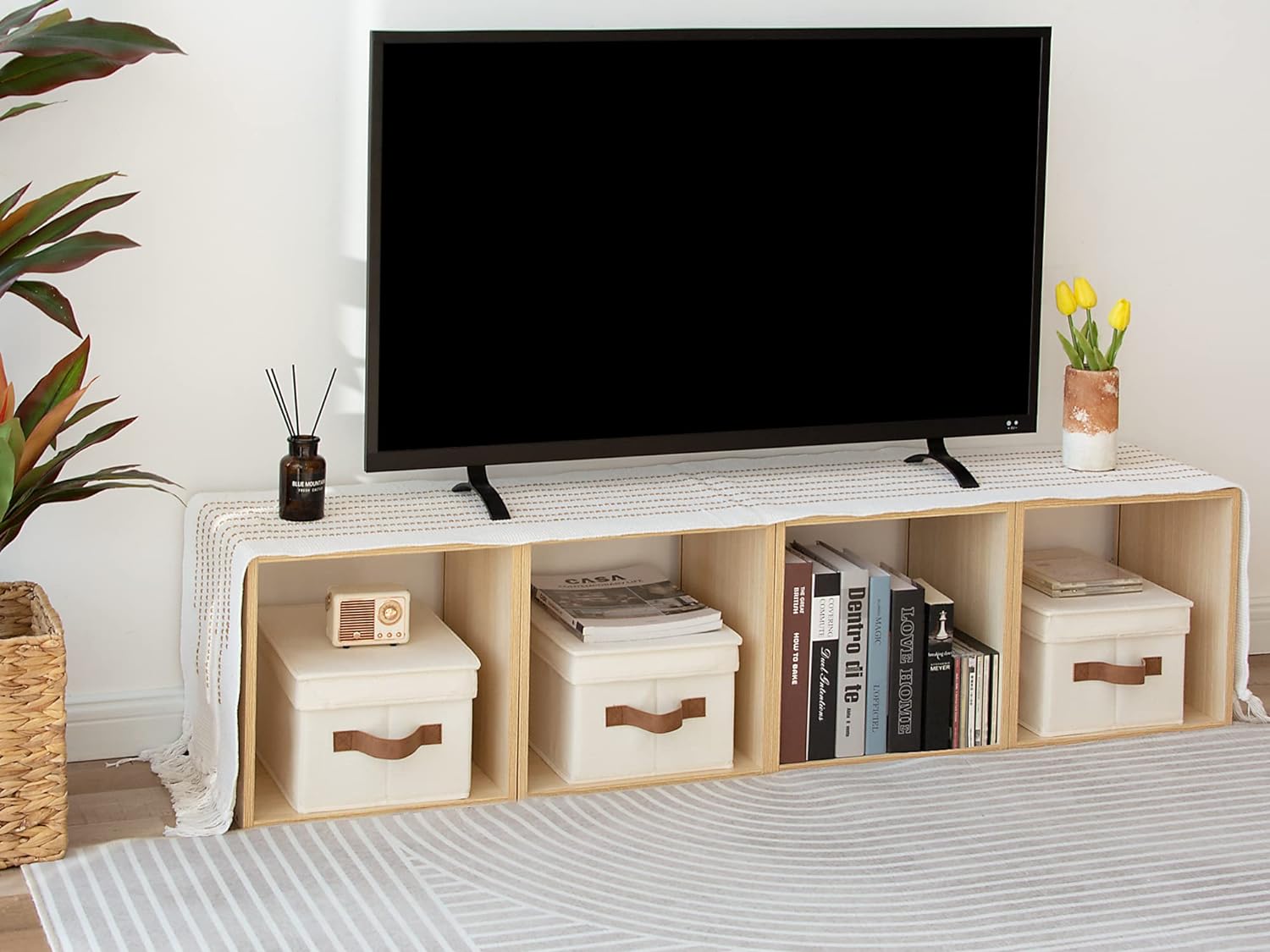 StorageWorks Storage Bins with Lids, Decorative Storage Boxes with Lid and PU Handles, Foldable Storage Baskets for Closet, Shelves, Stackable, Ivory White, Medium, 3-Pack