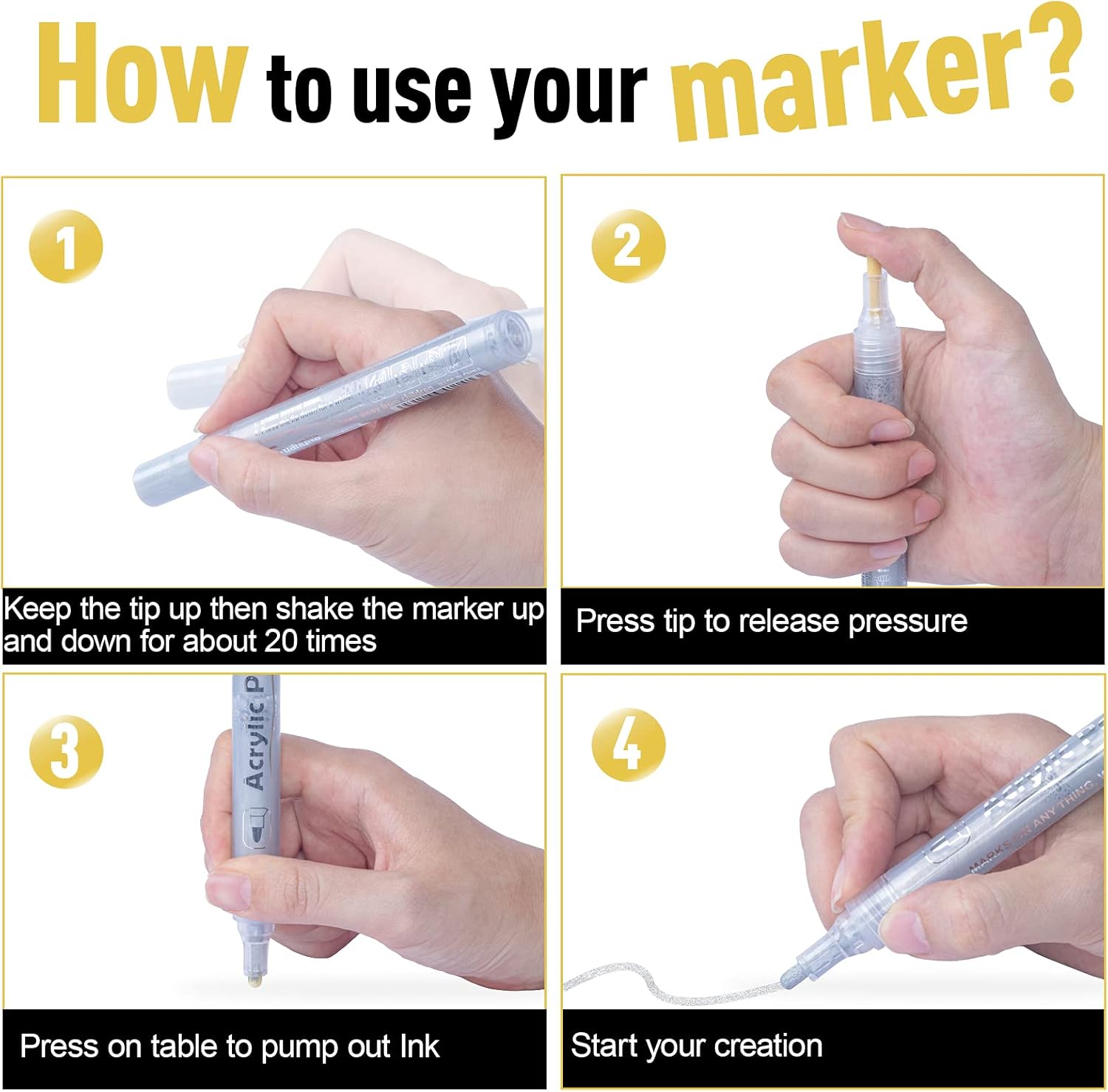- 【Usage Instructions & Tips】Step One: Shake the marker before use. Step Two: Press tip to release pressure. Step Three: Press the tip until to see the ink flow out. Step Four: Start your creation. Tips: For best results, tighten the pen cap promptly after use to prevent ink loss. This set of Silver paint pens is filled with water-based ink that is not storm resistant and is not recommended for use on trucks.