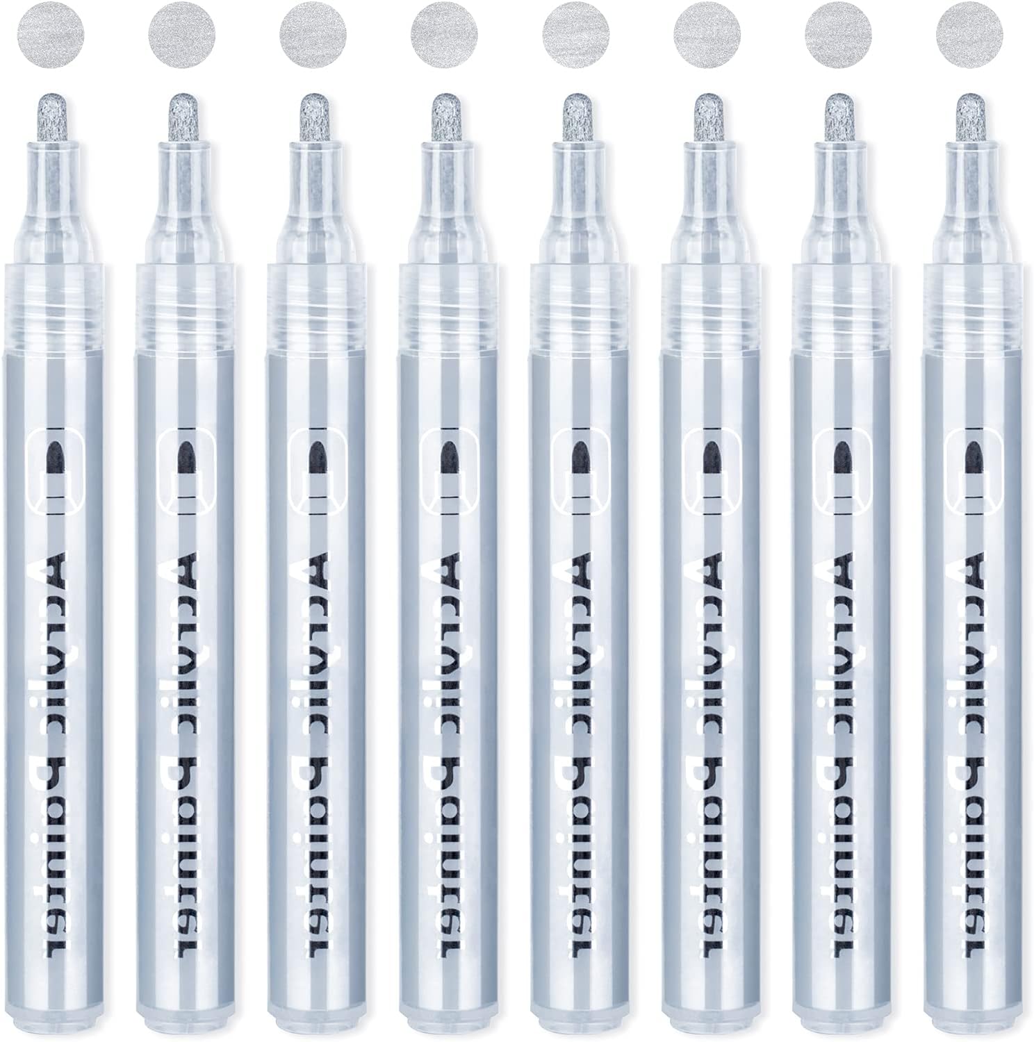 AKARUED Silver Acrylic Paint Markers, 8 Pack Acrylic Silver Paint Pen Sets for Rock Painting, Wood, Stone, Glass, Ceramic, Paper, Drawing, Art Projects, DIY Crafts, Water-Based ink, 2-3mm Medium Tip