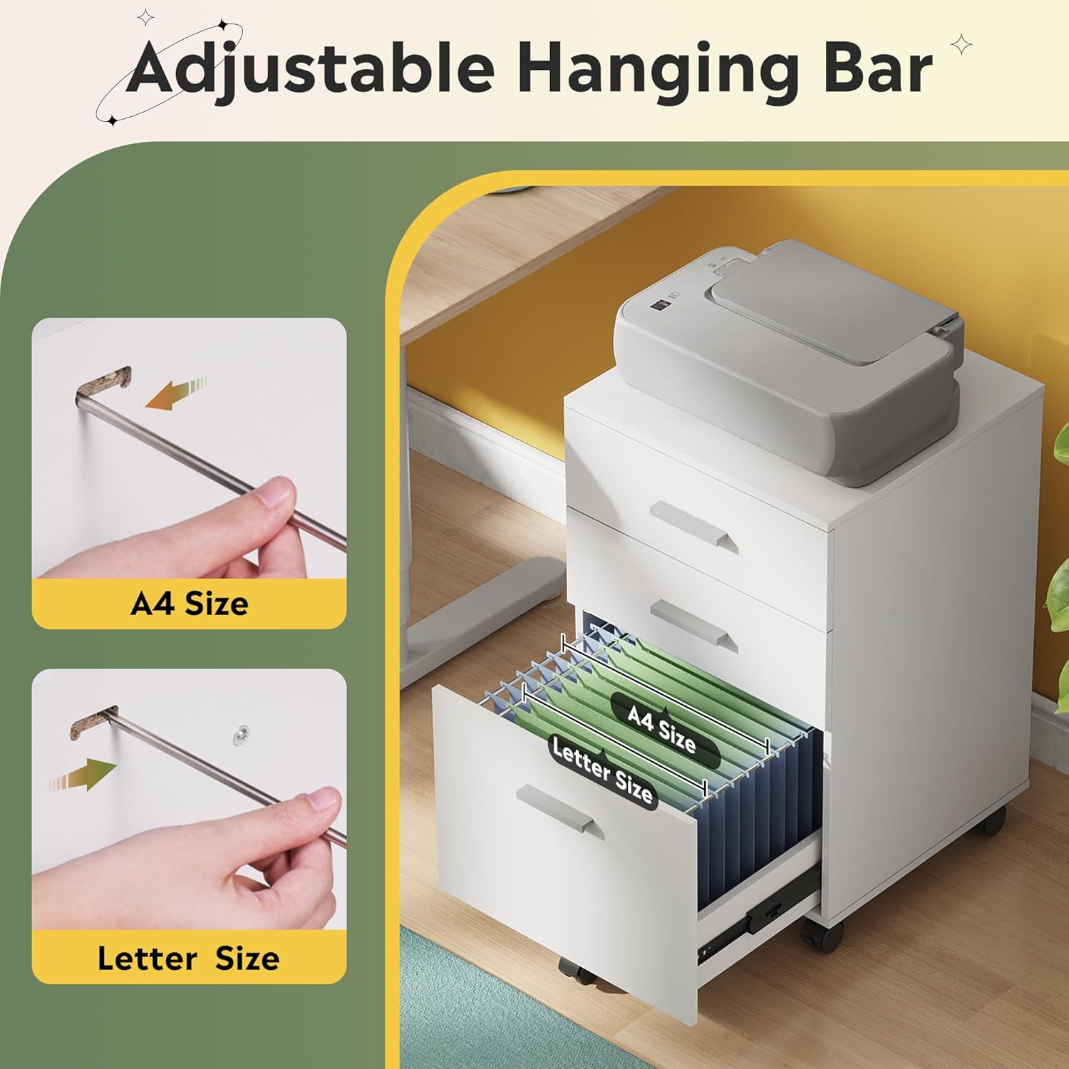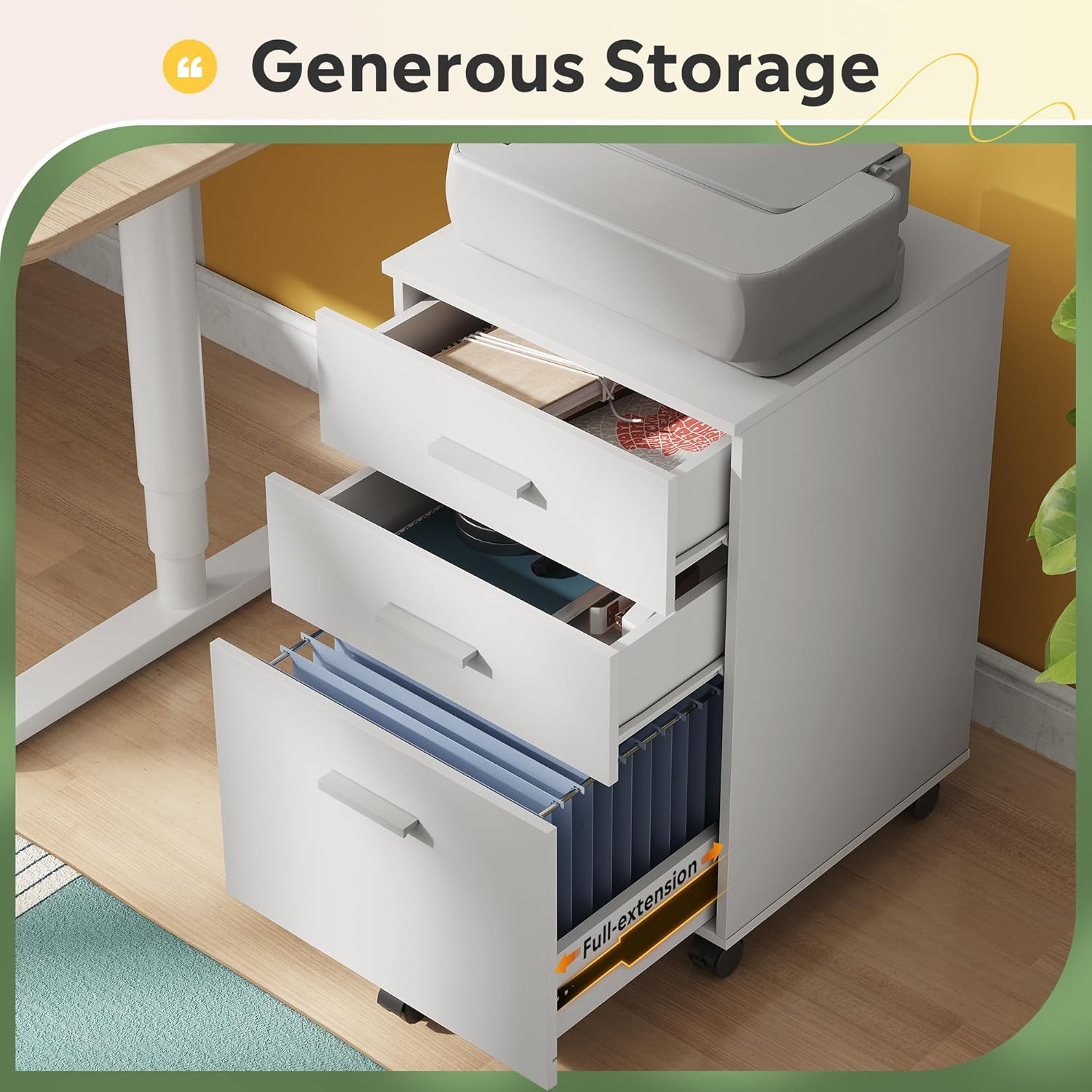 - GENEROUS STORAGE: This small file cabinet has 3 spacious drawers. You can put all your essentials inside, like printing paper, pens, books, or even snacks. The bottom drawer with file hanging frames to accommodates letter/ A4 size files. High-quality ball bearing glides ensure a lifetime of silky smooth opening and closing over many years.