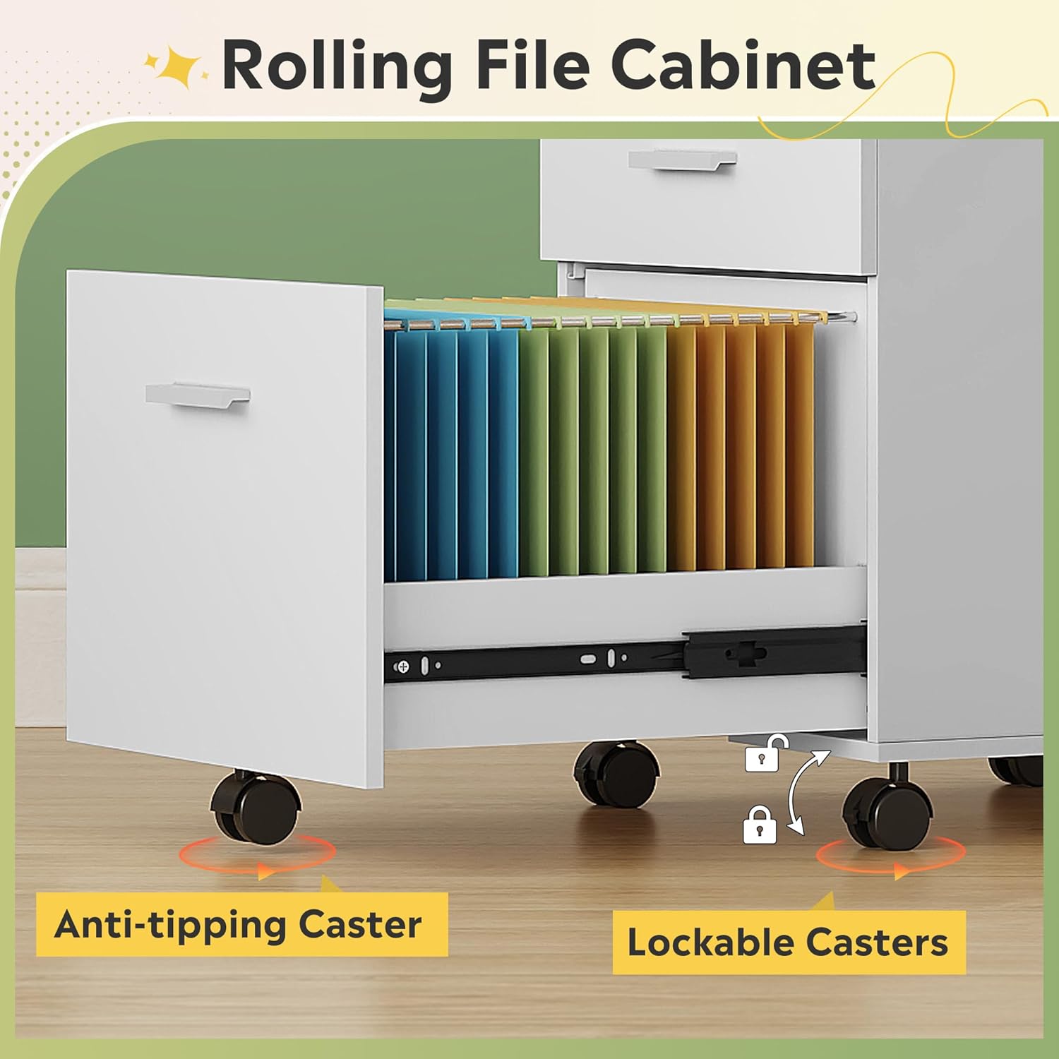 - DURABLE CASTERS: 5 rolling casters which can move smoothly on both wooden floor and carpet. With front 2 lockable breaking wheels, makes office supply rested on top, like printer. Middle caster prevents tipping over when all drawers open at the same time.