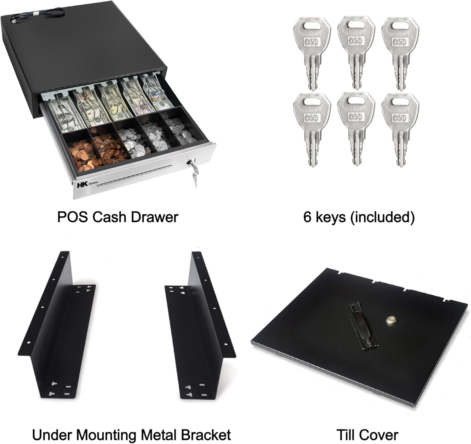 - Included Components : 6 Keys, Under Counter Mounting Metal Bracket and Till Cover