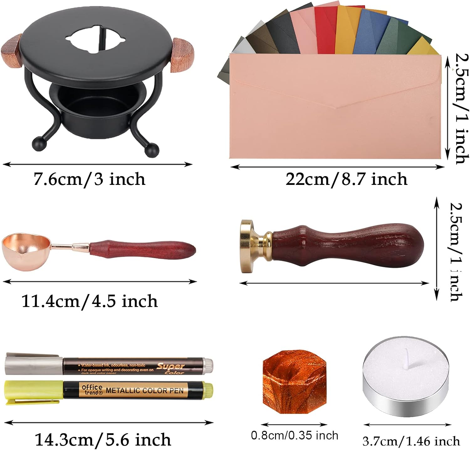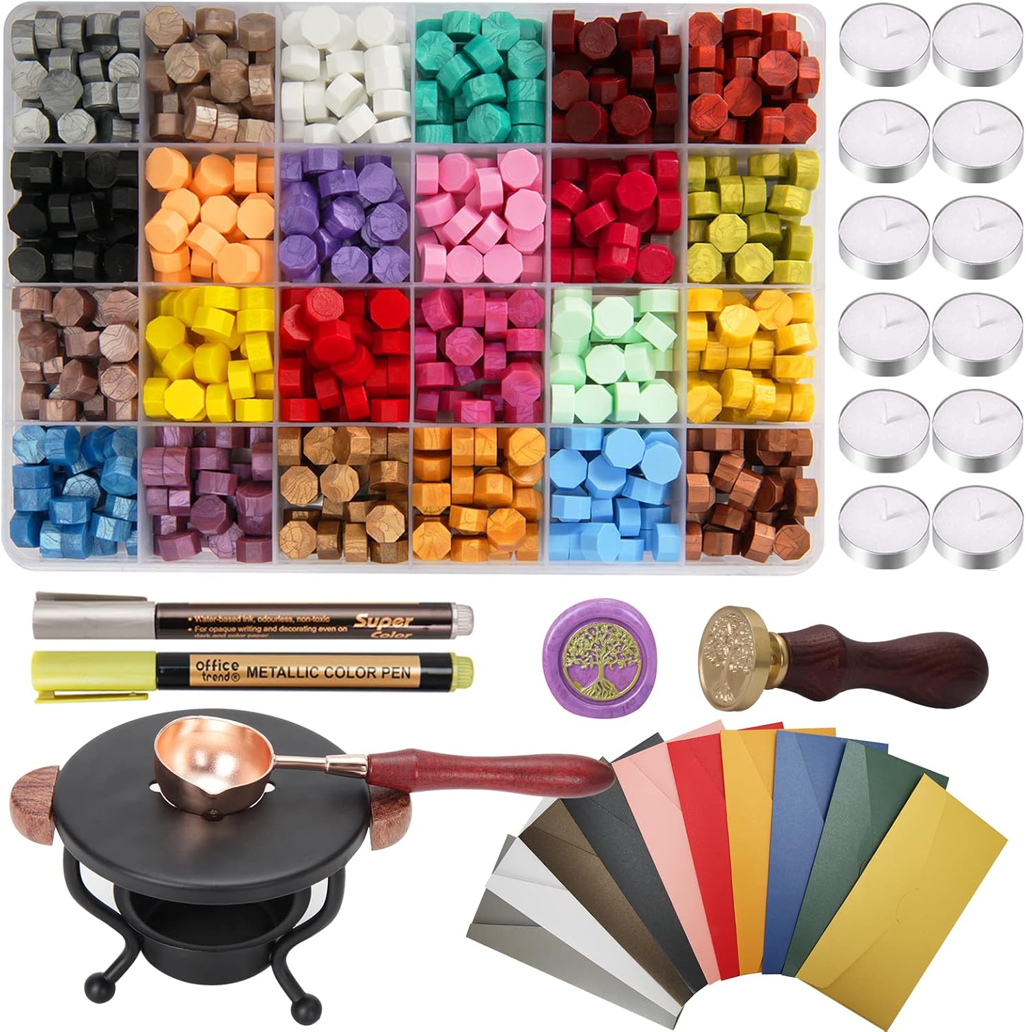 - What You Will Get: This wax seal kit comes with a box of 720 pieces of sealing wax beads in 24 different colors; a wax seal warmer; a wax melting spoon; a handle; a wax stamp with "tree of life"; 12 tea light candles; 10 different color envelopes; and 2 metallic pens; this practical comprehensive set will meet all your wax sealing needs