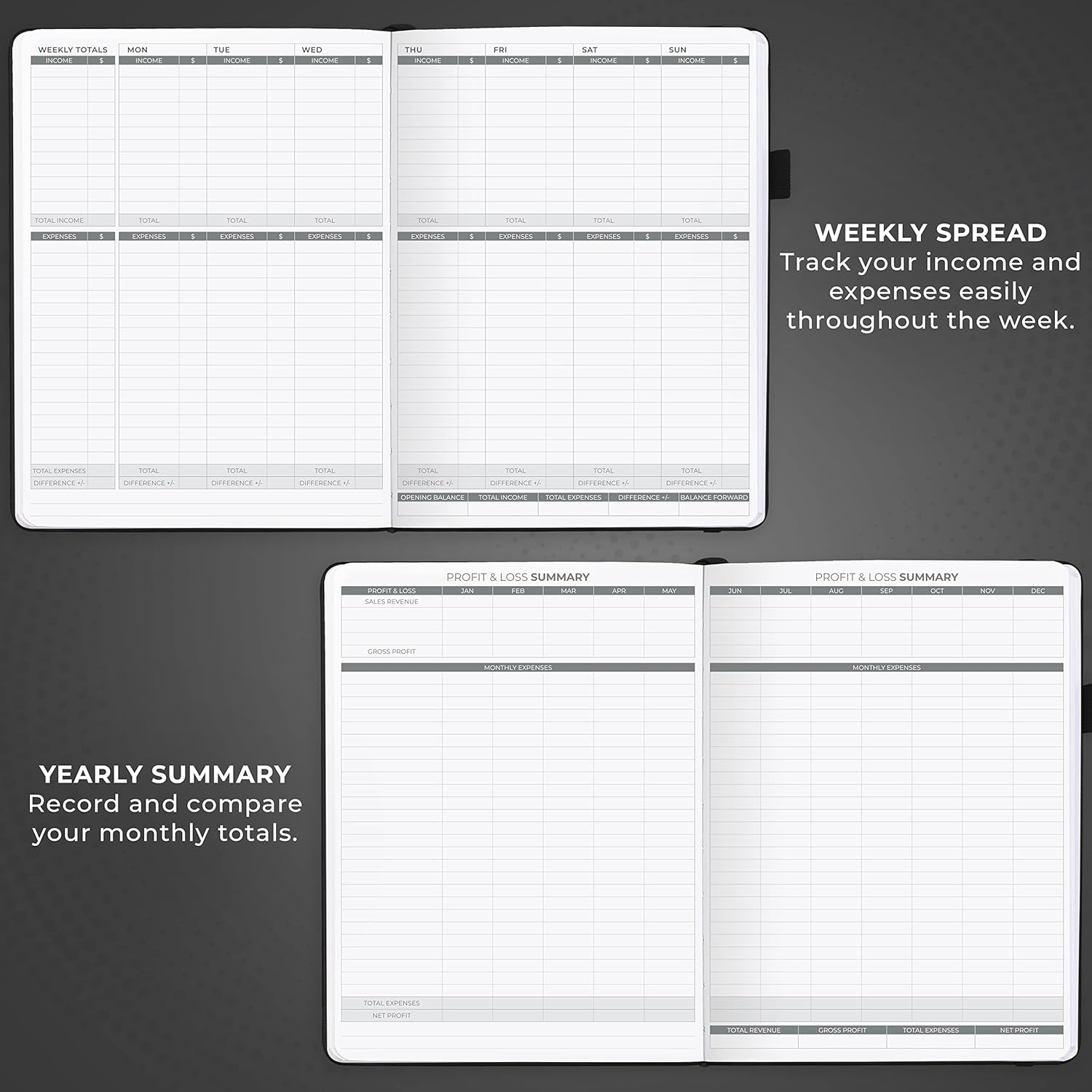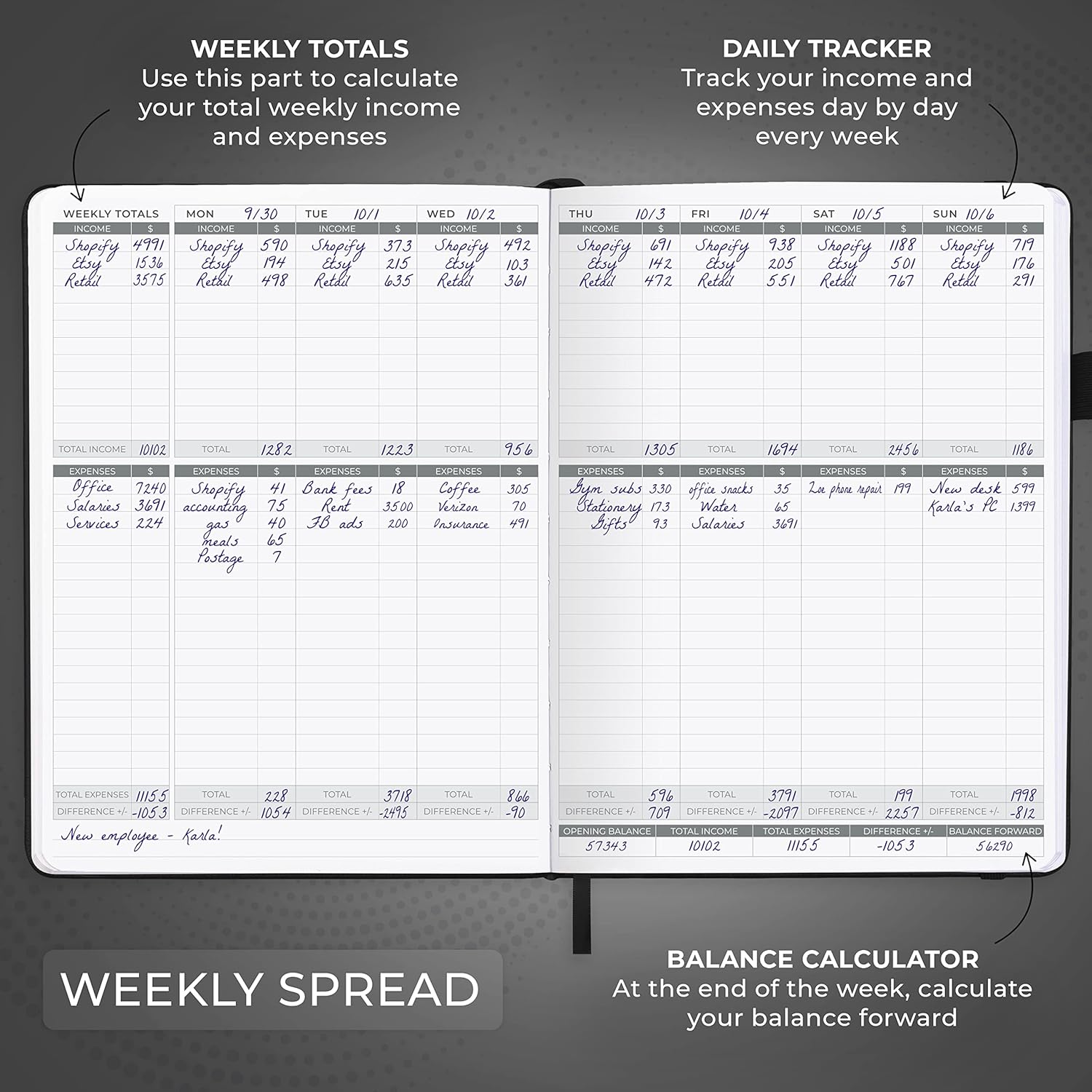 - 2 FULL YEARS OF STRESS-FREE ACCOUNTING: This accounting book is undated and lasts 2 years and has 225 pages, including 106 weekly views, 2 annual summaries, empty note pages, and, at the back, a spacious pocket for receipts.