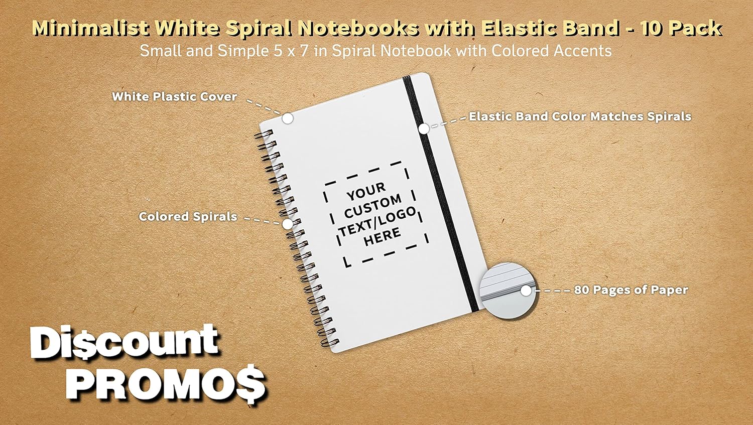 10 White Spiral Notebooks with Elastic Band Pack - Customizable Text, Logo - 80 lined pages, Recycled - Black
