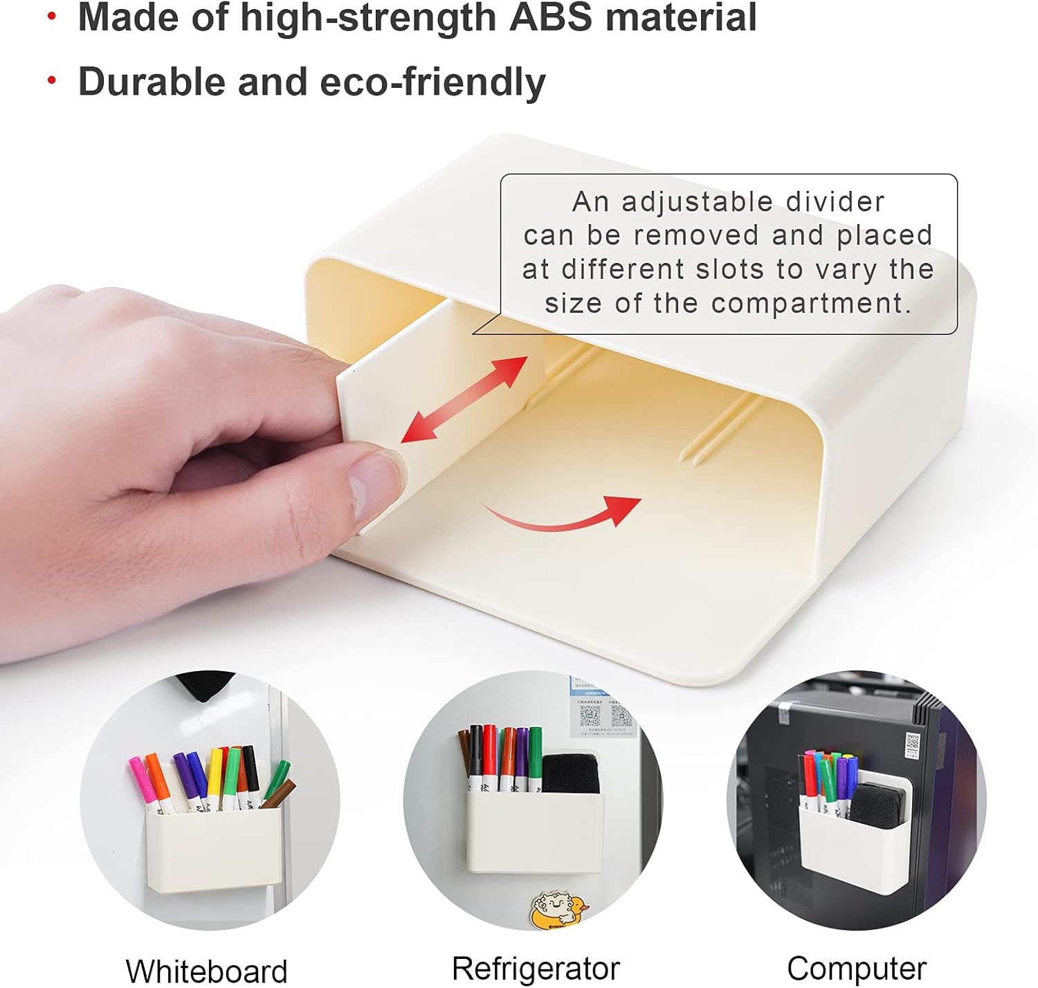 - ✅【Magnetic Plastic Holder】The magnetic holder features a powerful magnetic back that can securely attach on metal surfaces without sliding or falling and remove with ease. It does NOT fit for glass board or other surfaces which are not made of metal. An adjustable divider can be removed and placed at different slots to adjust the size of the compartment. Holder size 5”X1.7”X4.6” enough storage capacity to include 12 dry-erase markers. High-strength ABS material, durable and eco-friendly.