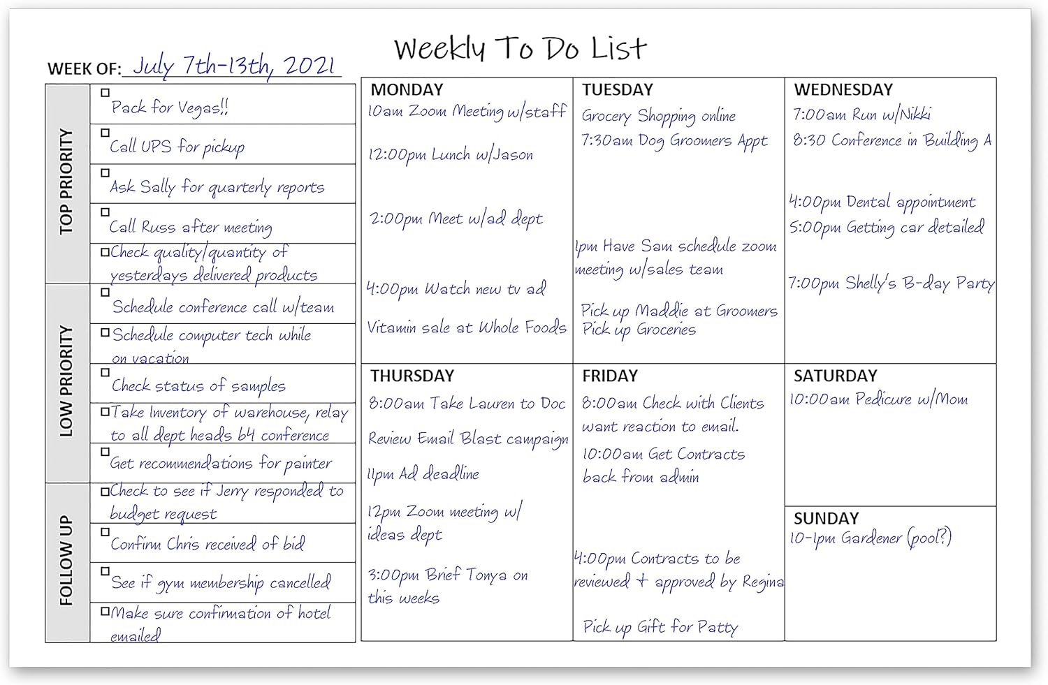 - Weekly To Do List Notepads. Two Pack, 50 Pages Each, Total 100 Pages. Weekly to-do list notepads that house a checklist, a top priority, a low priority, and a follow-up section, along with sections to make notes or appointments on Monday through Sunday. Each notepad has 50 pages. The perfect size, at 8.5 X 5.5 Inch A5 Tear Sheets. Quality 70 pound smooth white paper with chipboard backing. Clean and elegant-looking checklist weekly planner.