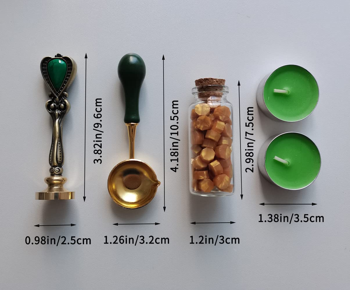 - [Package includeds] 1*Fancy letters R Seal Stamp , Gold Sealing Wax Beads x 1 Bottle(about 60 pcs), 2*Green Candles, 1*Melting Spoon, 1*Gift Box.