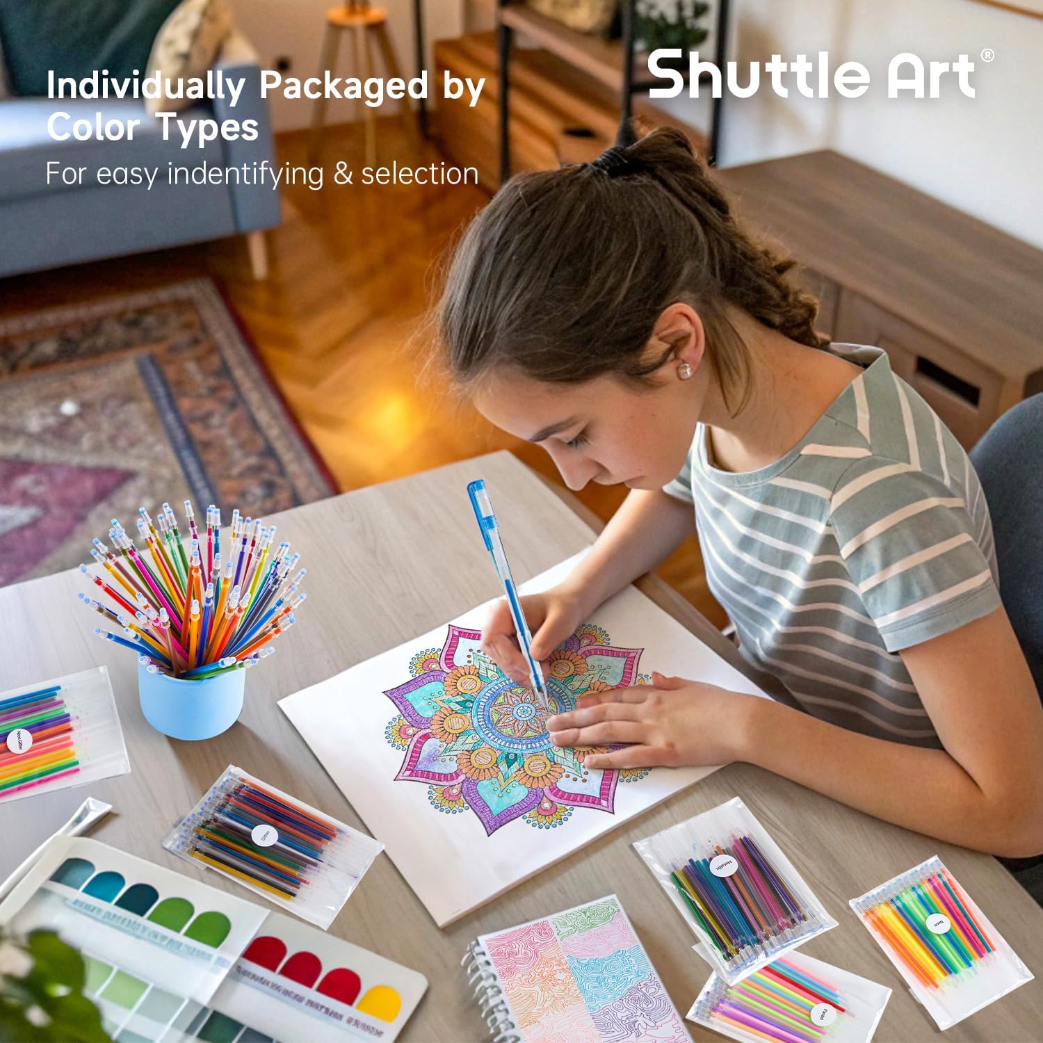 - 120 UNIQUE COLORS: Shuttle Art Gel Pen Refills Set has 120 unique colors, including 7 color types: glitter, neon glitter, metallic, neon, pastel, swirl, standard. Abundant colors with varied color types, fully meet your demands of coloring, writing and drawing.