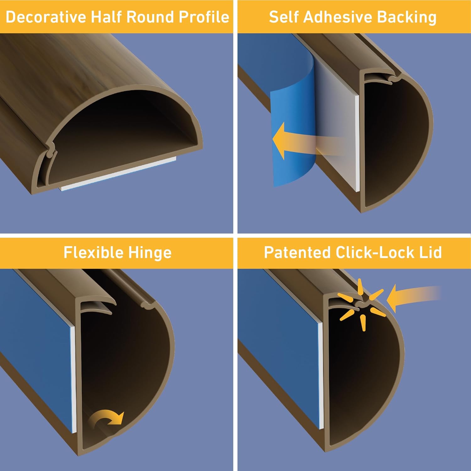 - D-Line 1.18” (W) x 0.59” (H) Cable Raceway is a great wall cord cover, with D-Line’s decorative half round wire cover blending with décor… and able to subtly appear as the natural top section of baseboards.