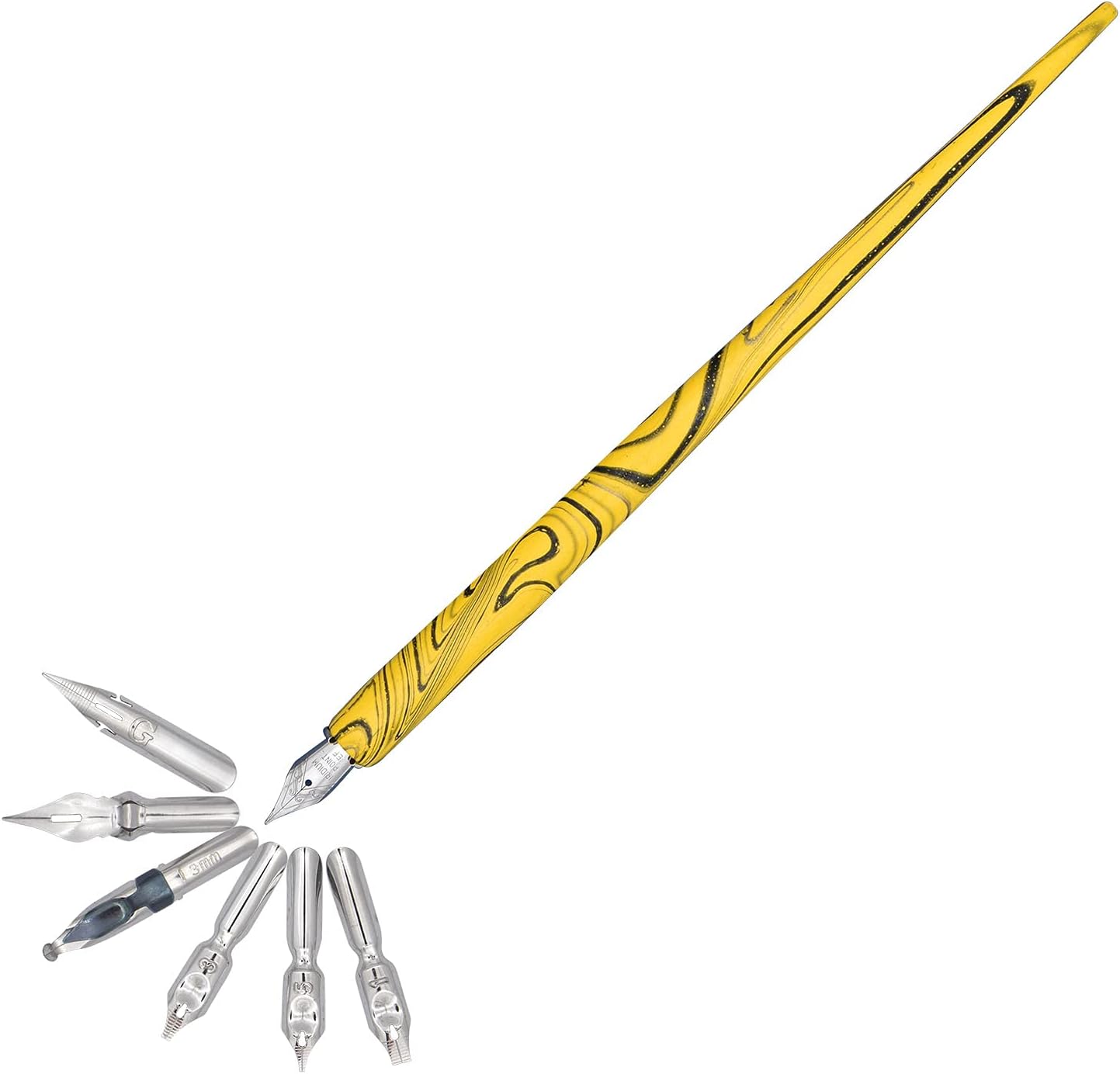 Gullor Wooden Dip Pen Calligraphy Set with Black Ink & 6 Nibs for Beginners, Kids, Writing, Signatures and Drawing, Yellow