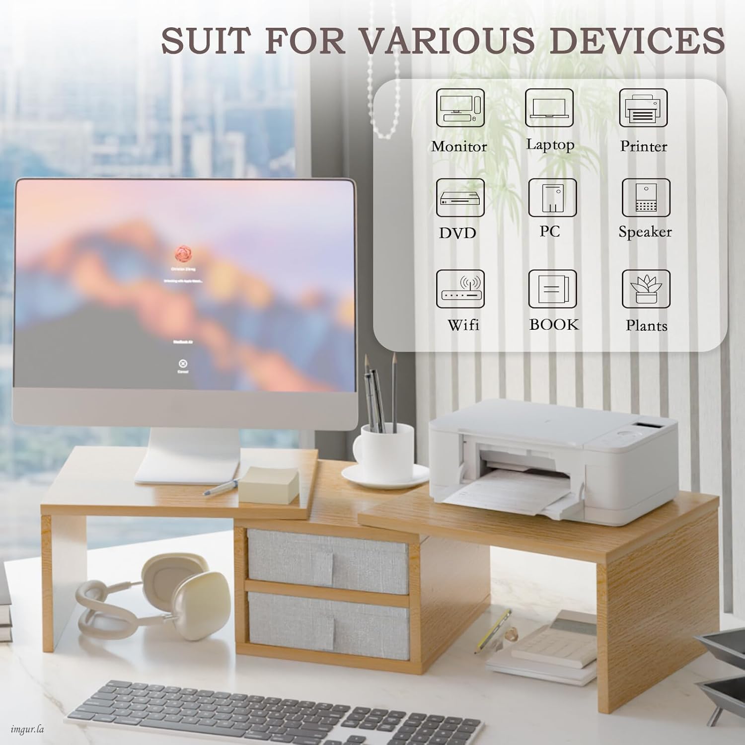 - 【Versatile Stand for 2 Devices】Dual monitor stands for 2 monitors, laptops, printers computers, this 3 shelf desk shelf is designed to accommodate all your office equipment. Its versatile design ensures it fits your workspace, making it an helper to your home or office setup.