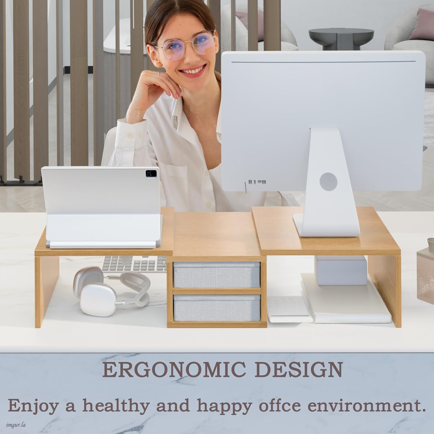 TEAMIX 42 inch Dual Monitor Stand Riser with 2 Drawers- Length and Angle Adjustable 3 shelf Riser with Storage Desk Organizer Computer Monitor Stand for 2 Monitors/Laptop/PC,Screen/TV Stand Riser
