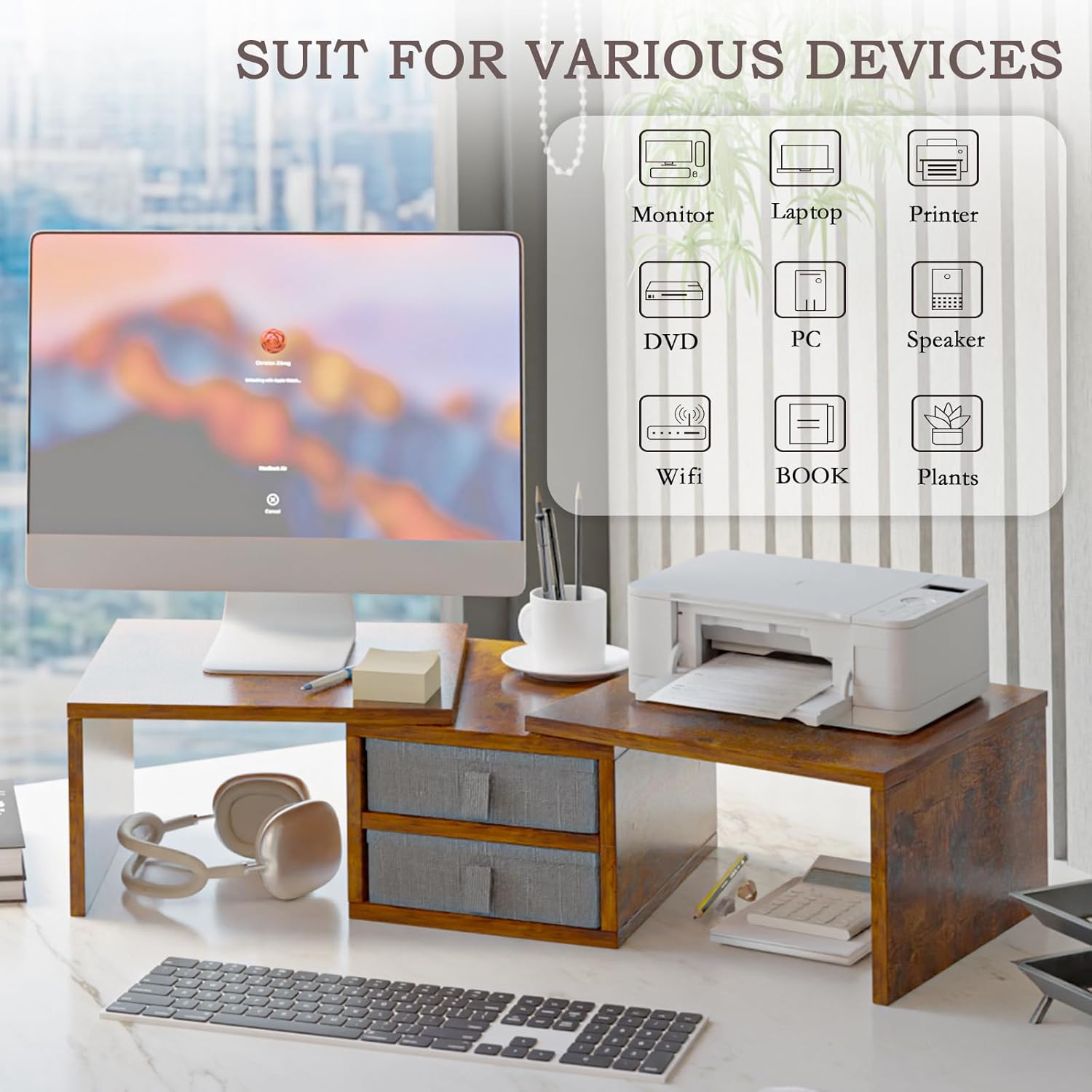 - 【Versatile Stand for 2 Devices】Dual monitor stands for 2 monitors, laptops, printers computers, this 3 shelf desk shelf is designed to accommodate all your office equipment. Its versatile design ensures it fits your workspace, making it an helper to your home or office setup.