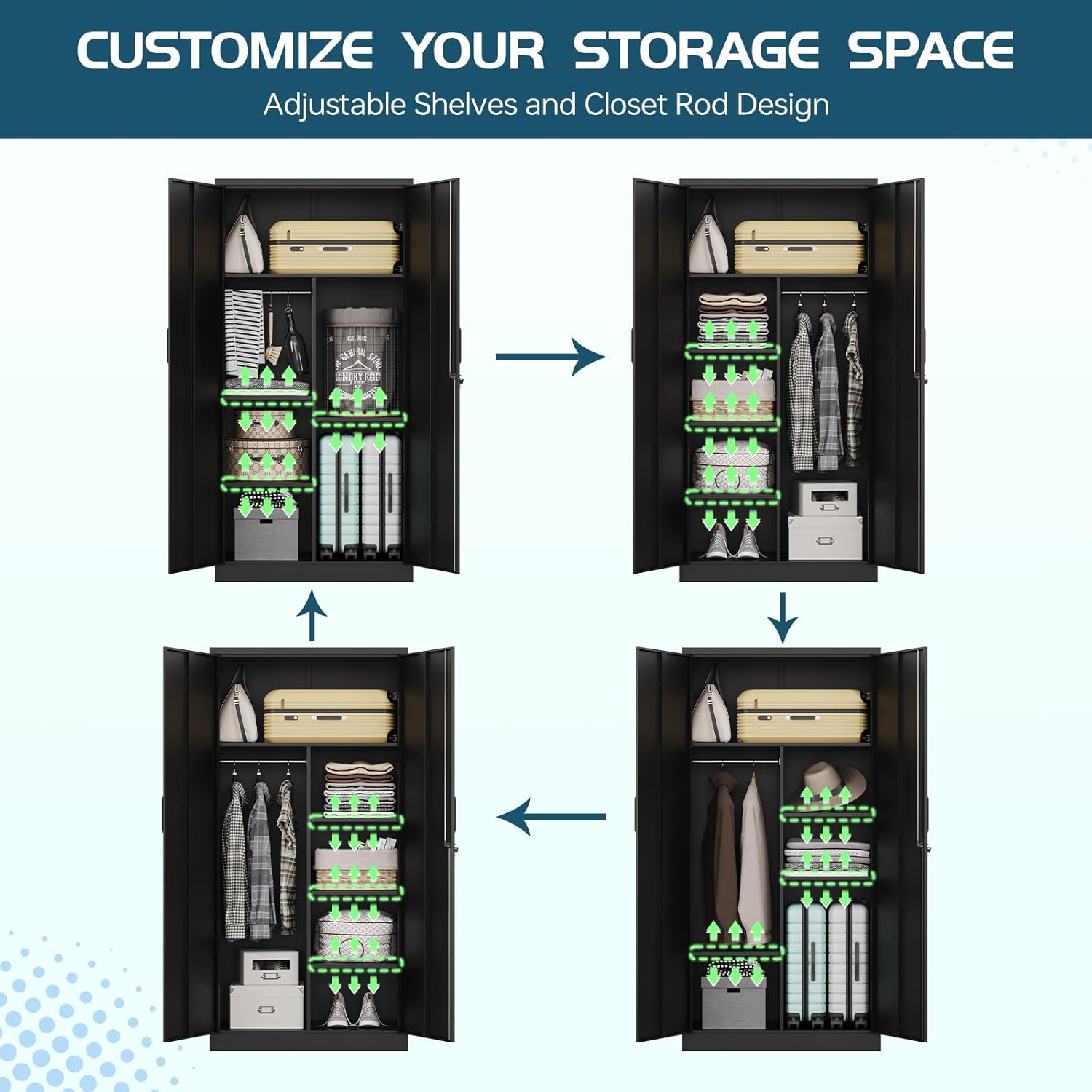 - ăMultipurpose Storage Solutionă: Metal Storage Cabinet with 4 shelves and hanging rod can provide you spacious storage space, flexible adaptability and convenience. Whether hanging clothes or storing bedding, bags, cleanings or shoes, you can create a customized storage space. 3 adjustable shelves can divid space freely to meet your different storage needs.