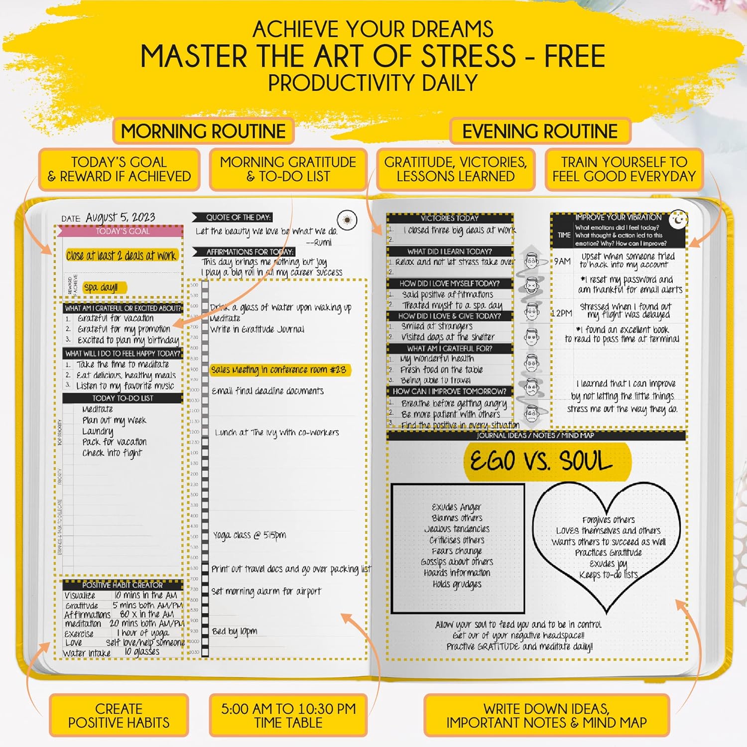 - LUXURIOUS AND TOP QUALITY - Self-care journal for women and men, perfect for entrepreneurs, professionals, college students and everyone who has burning desire to turn dreams into reality! FREE VIDEO MINI-COURSE: You will learn 10-min morning routine used by the most successful people to 10-fold your productivity, focus, happiness & passion! You will master setting goals & fix procrastination!