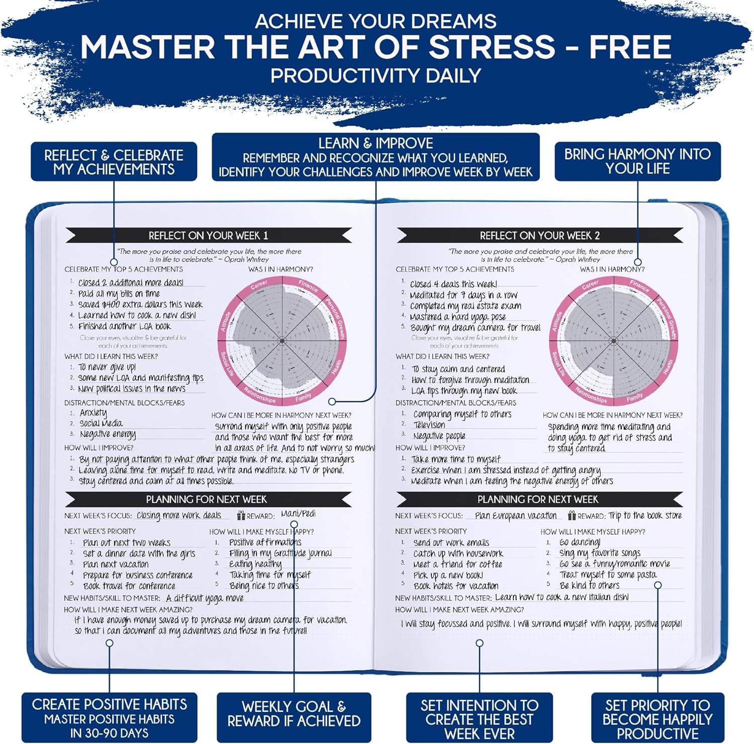 - LUXURIOUS AND TOP QUALITY - Self-care journal for women and men, perfect for entrepreneurs, professionals, college students and everyone who has burning desire to turn dreams into reality! FREE VIDEO MINI-COURSE: You will learn 10-min morning routine used by the most successful people to 10-fold your productivity, focus, happiness & passion! You will master setting goals & fix procrastination!