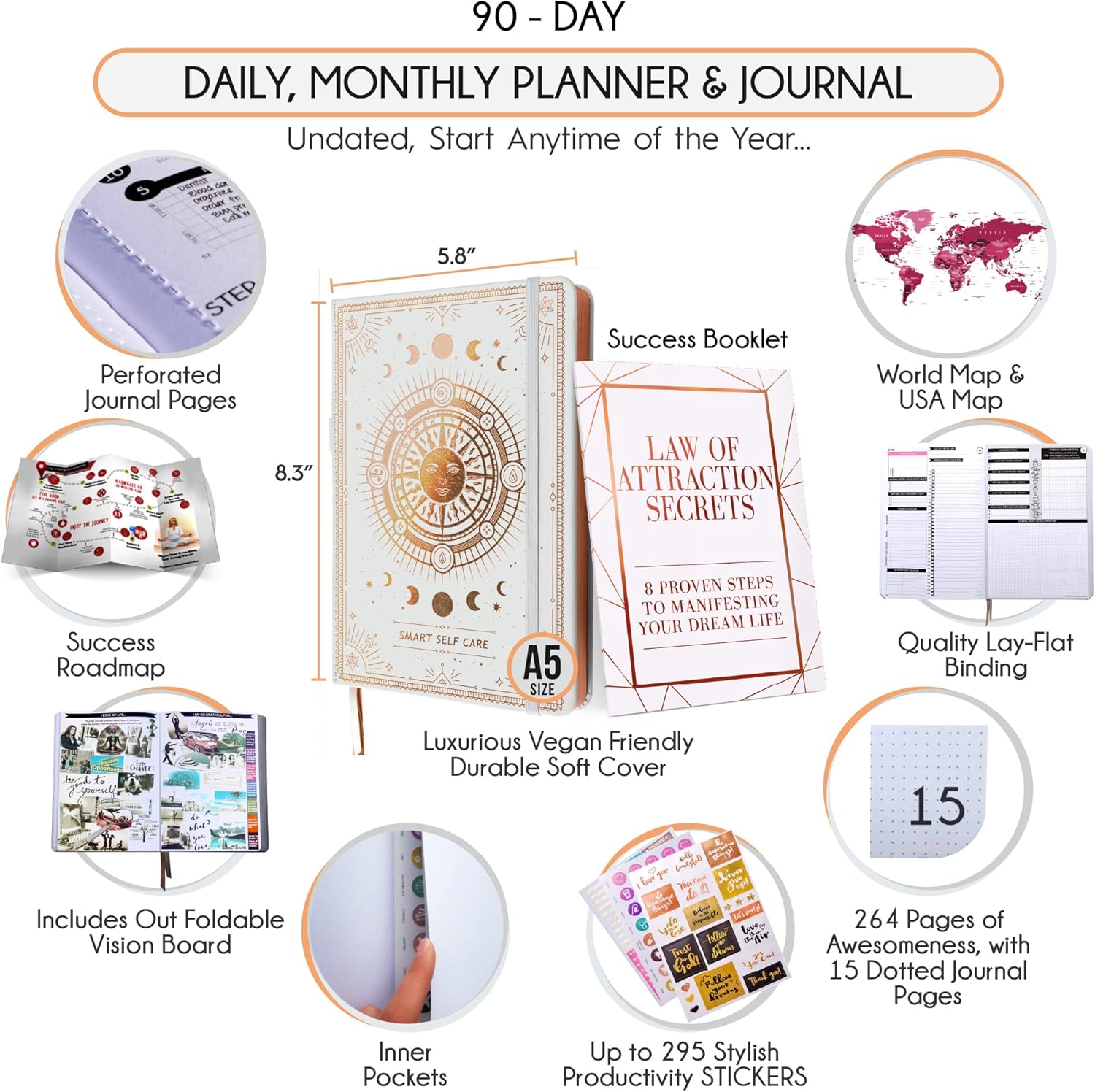 - ADHD PLANNER FOR ADULTS - This deluxe daily planner and self-care journal comes in A5 size (5.8 x 8.3 inches). The life planner comprises 264 pages of thick 100 gsm paper, including 90 daily planning sheets, guiding you on how to become the best possible version of yourself on a mental, physical, and interpersonal level. It's a unique diary based on leading scientific studies proven to increase productivity and happiness. The journal features an out-foldable vision board to help you stay focused, morning and evening power questions, mind maps, reflection pages, habit trackers, a back pocket, and much more than any other planner on the market!