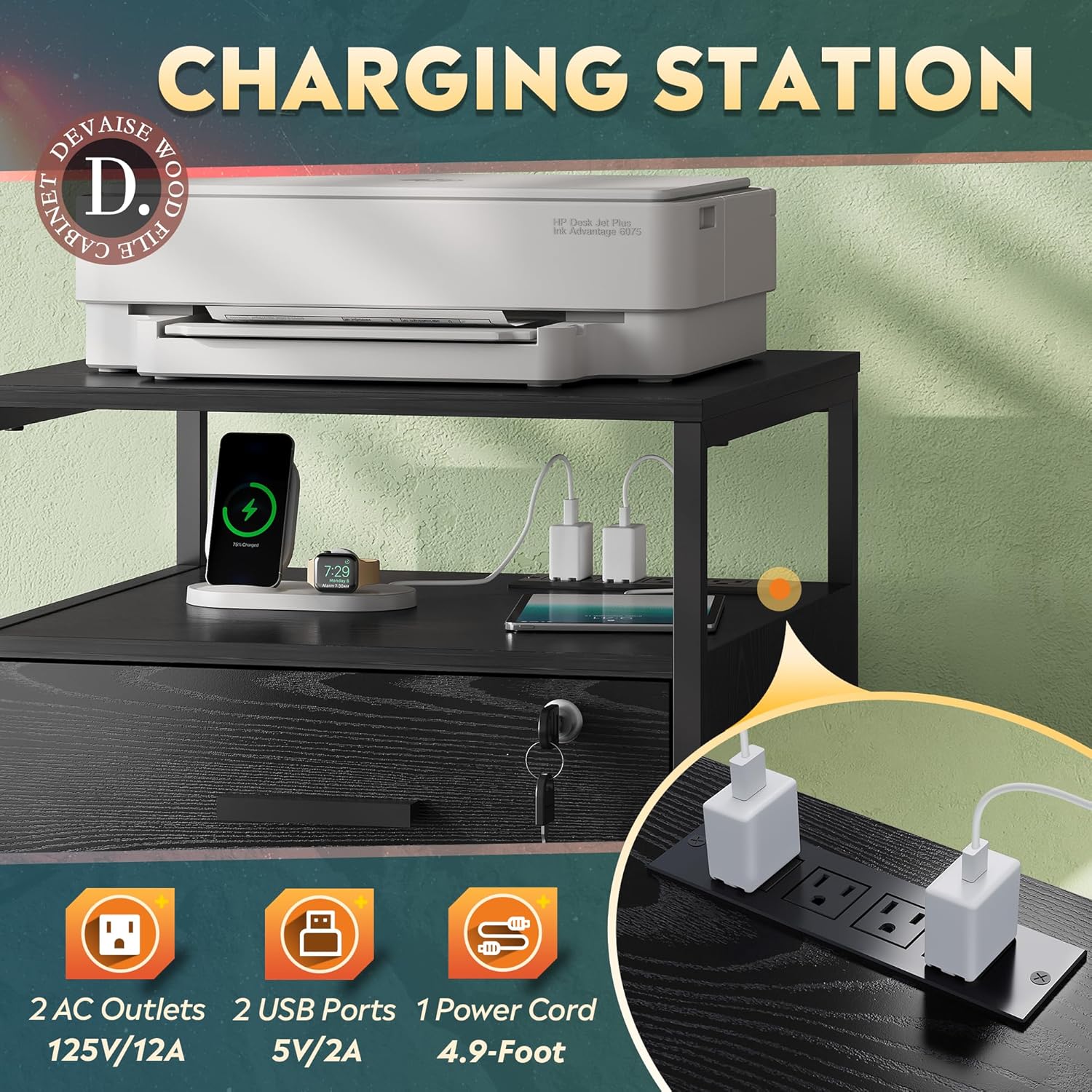 DEVAISE 2 Drawer File Cabinet with Lock and Charging Station, Wood Filing Cabinet fits A4 or Letter Size, Mobile Printer Stand with Open Storage Shelf for Home Office, Black