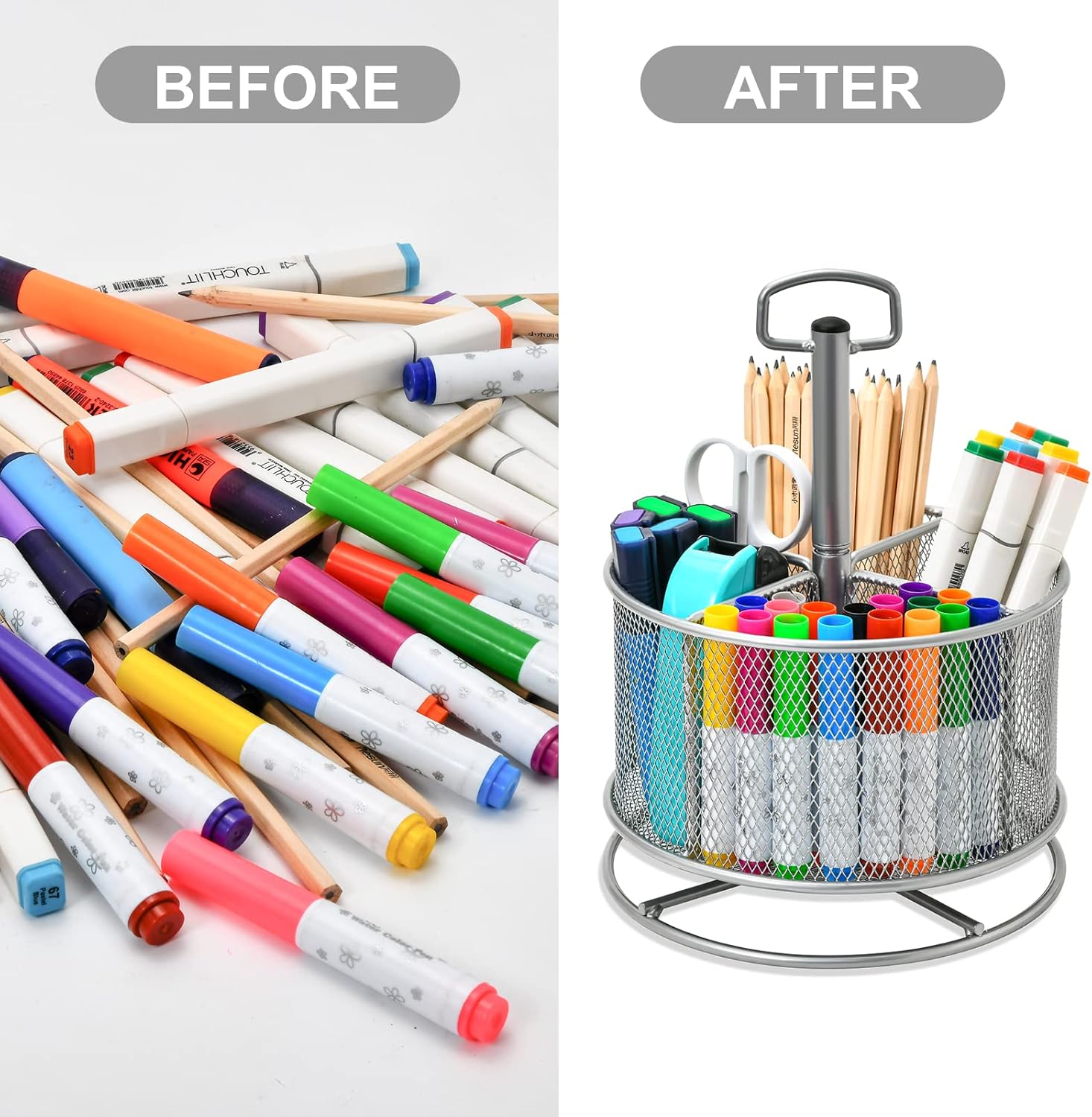 - 【Multipurpose Desktop Organizer】: This rotating storage organizer is perfect for pencils ,cosmetics, bathroom necessities, toiletries and even kitchen utensils.Try it in your craft room, playroom, laundry/utility room and even inside bathroom cabinets or under the sink; Store extra office supplies like painting pens, correction tape,scissors ,TV Remote and more; Even headphones or a charger will no longer be lying around in the future! Maximize your vertical space and keep your desk clear