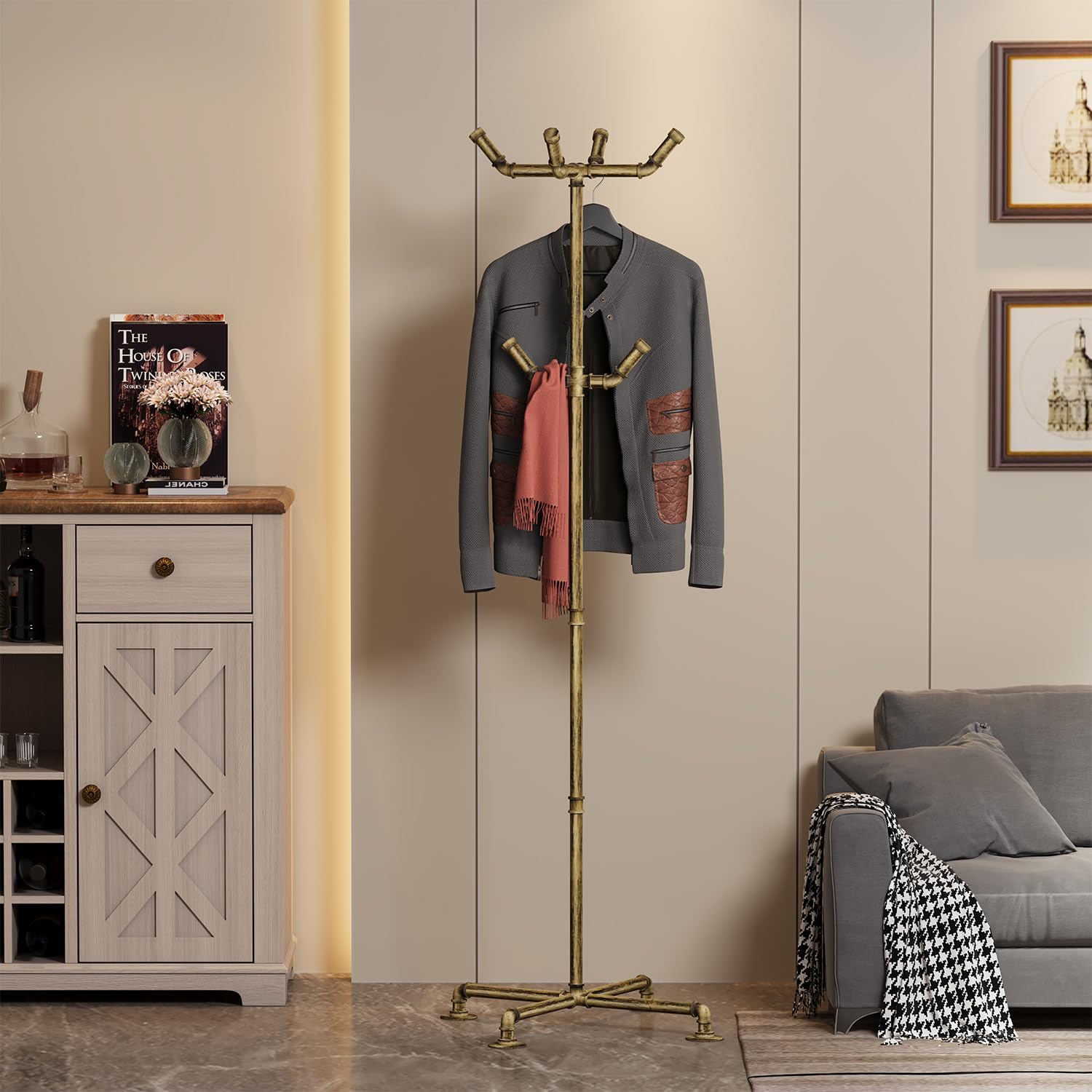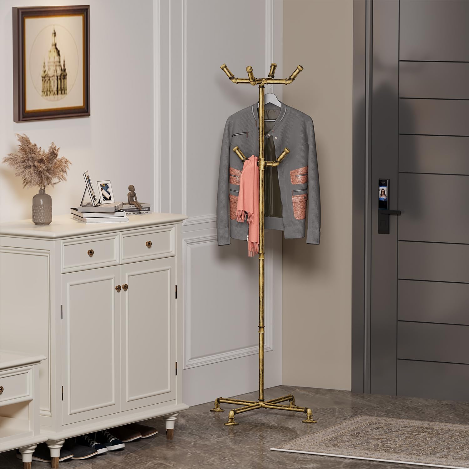 Industrial Coat Rack, Metal Pipe Coat Rack Stand Freestanding with 6 Hooks, Heavy Duty Coat Tree Sturdy Coat Racks for Entryway, Hallway, Bedroom (Vintage gold)