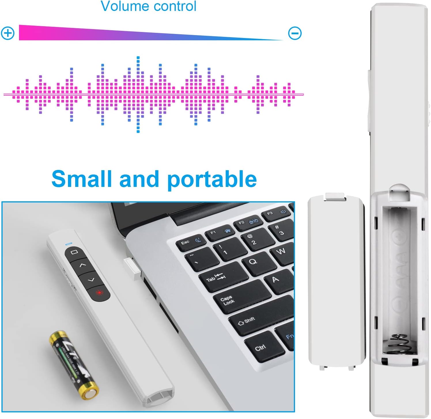 - [ Perfect Tool and Gift ] The presentation clicker will be the perfect tool for your presentation, teaching and meeting, and it will be the best gift for your friends or family. Power by 1* AAA battery.