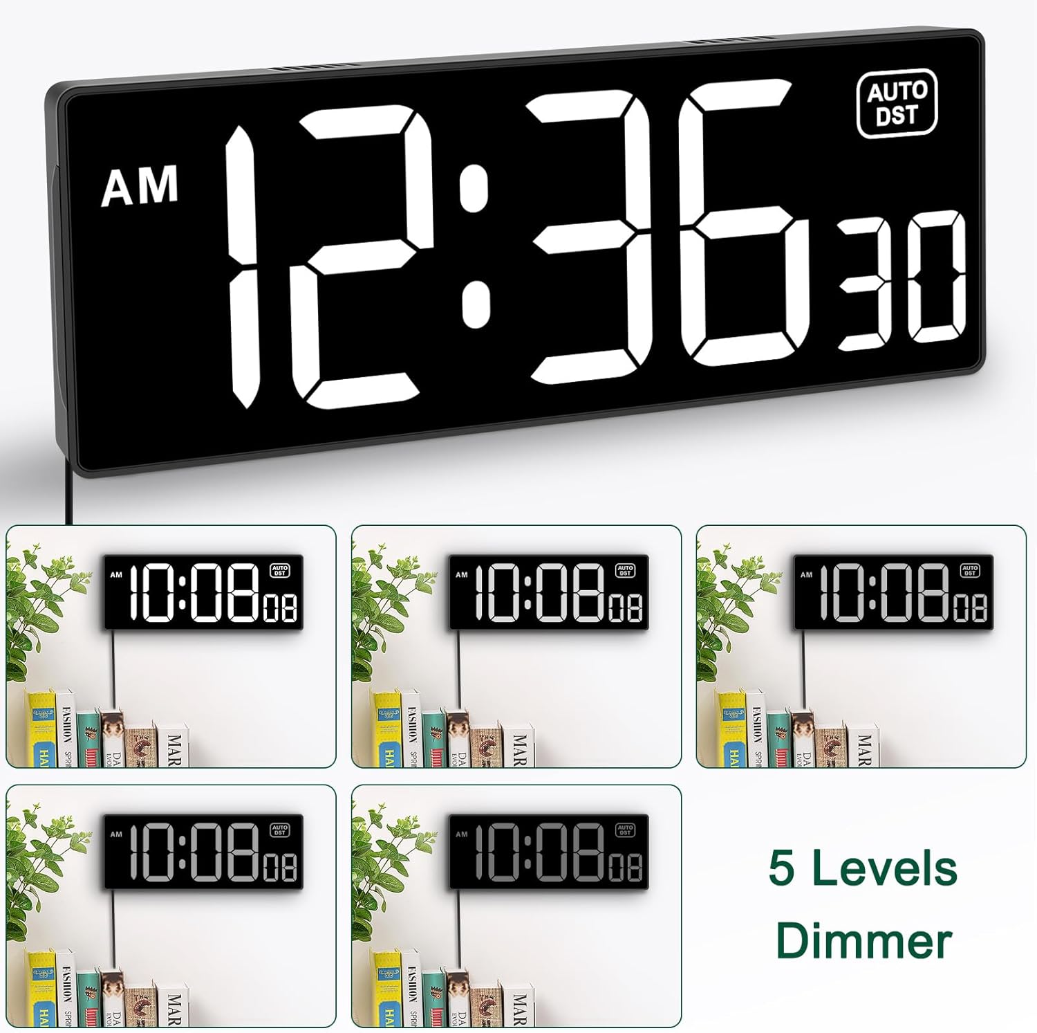 - ๐๐ถ๐ณ๐ณ๐ฒ๐ฟ๐ฒ๐ป๐ ๐ฏ๐ฟ๐ถ๐ด๐ต๐๐ป๐ฒ๐๐ ๐ฑ๐ถ๐บ๐บ๐ฒ๐ฟ - 5 levels adjustable dimmer, no matter the environment is too bright or too dark you can still see the time by adjusting the brightness with 1 button. If you want to have a good sleep, just set the lowest brightness before going to bed, or turn to the most shining level while your room has sufficient lighting.