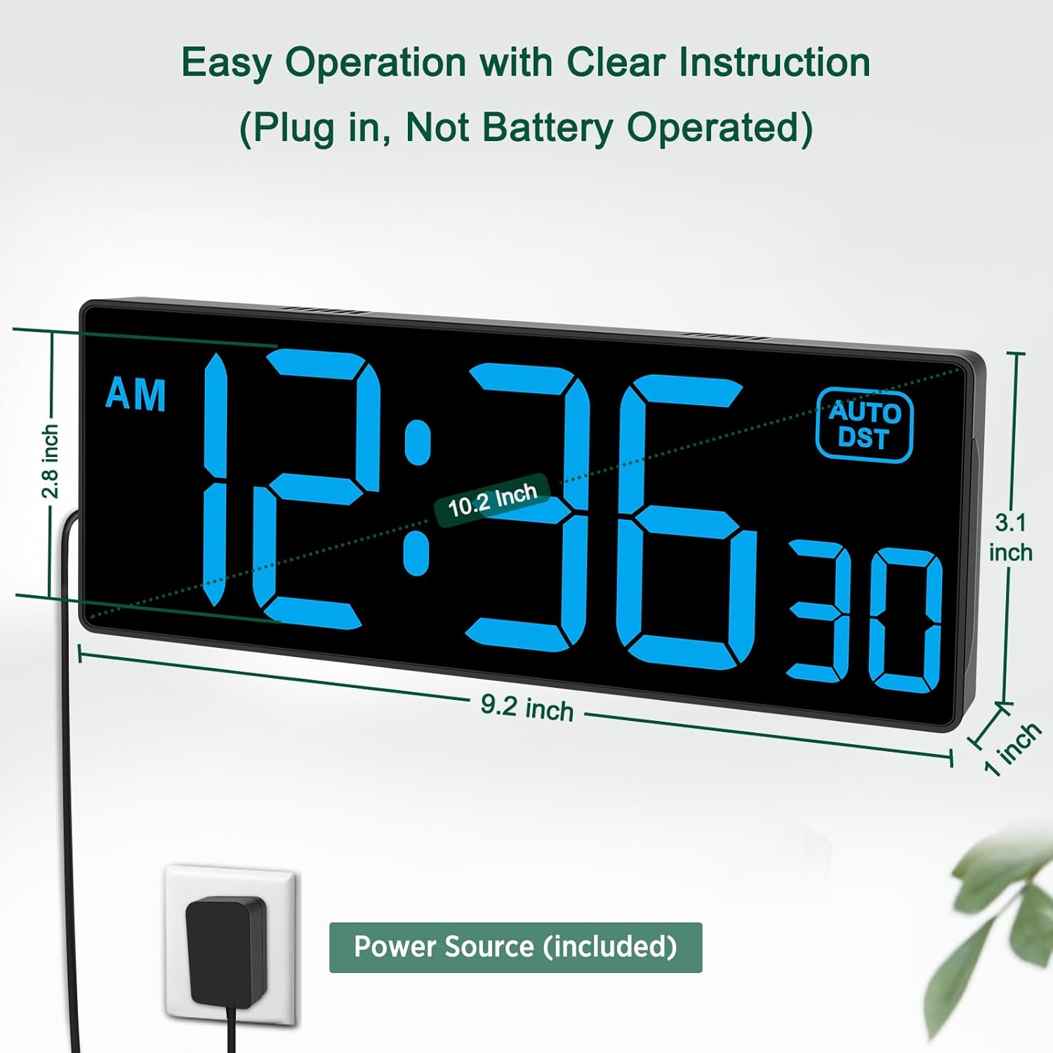 Soobest LED Wall Clock Digital Clock with Seconds, Electric Plug in Large Big Numbers Clock 5 Dimmers Wall Mount for Living Room, Auto DST, 10 Inches (Blue)