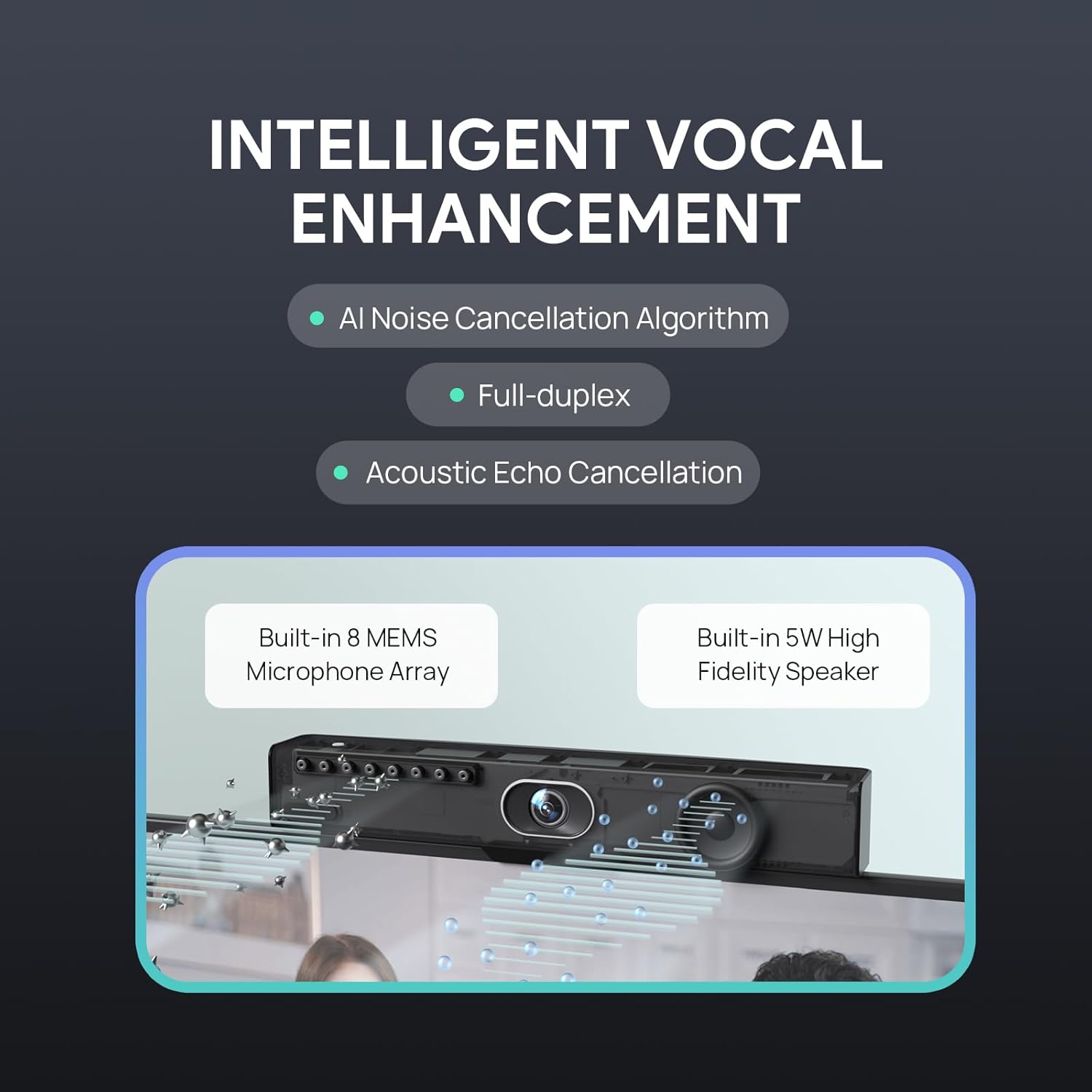 - Full-Duplex Audio - UVC34 built-in 8-microphone array and high-fidelity 5W speakers. Combined with the newly upgraded ▶beamforming algorithm, the sound pickup is more accurate, and the anti-noise and de-reverberation effects are significant. ▶Acoustic echo cancellation technology ▶Reverberation processing technology