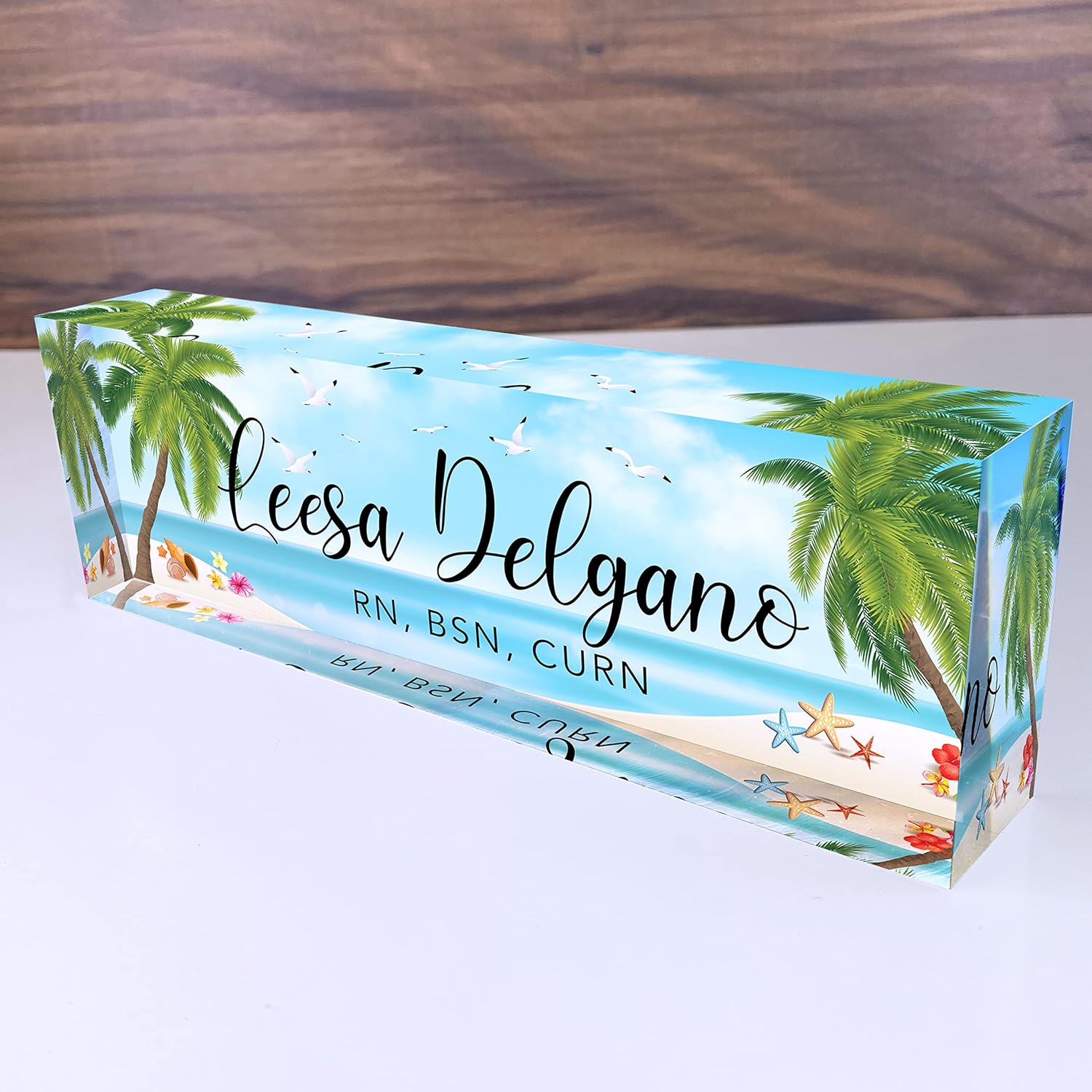 Artblox Office Desk Name Plate Personalized | Custom Name Plates for Desks | Sea Beach Design On Clear Acrylic Glass | Office Desk Decor - (8" x 2.5")