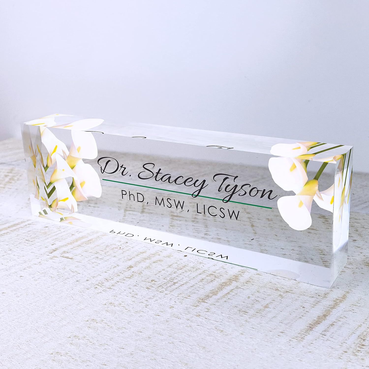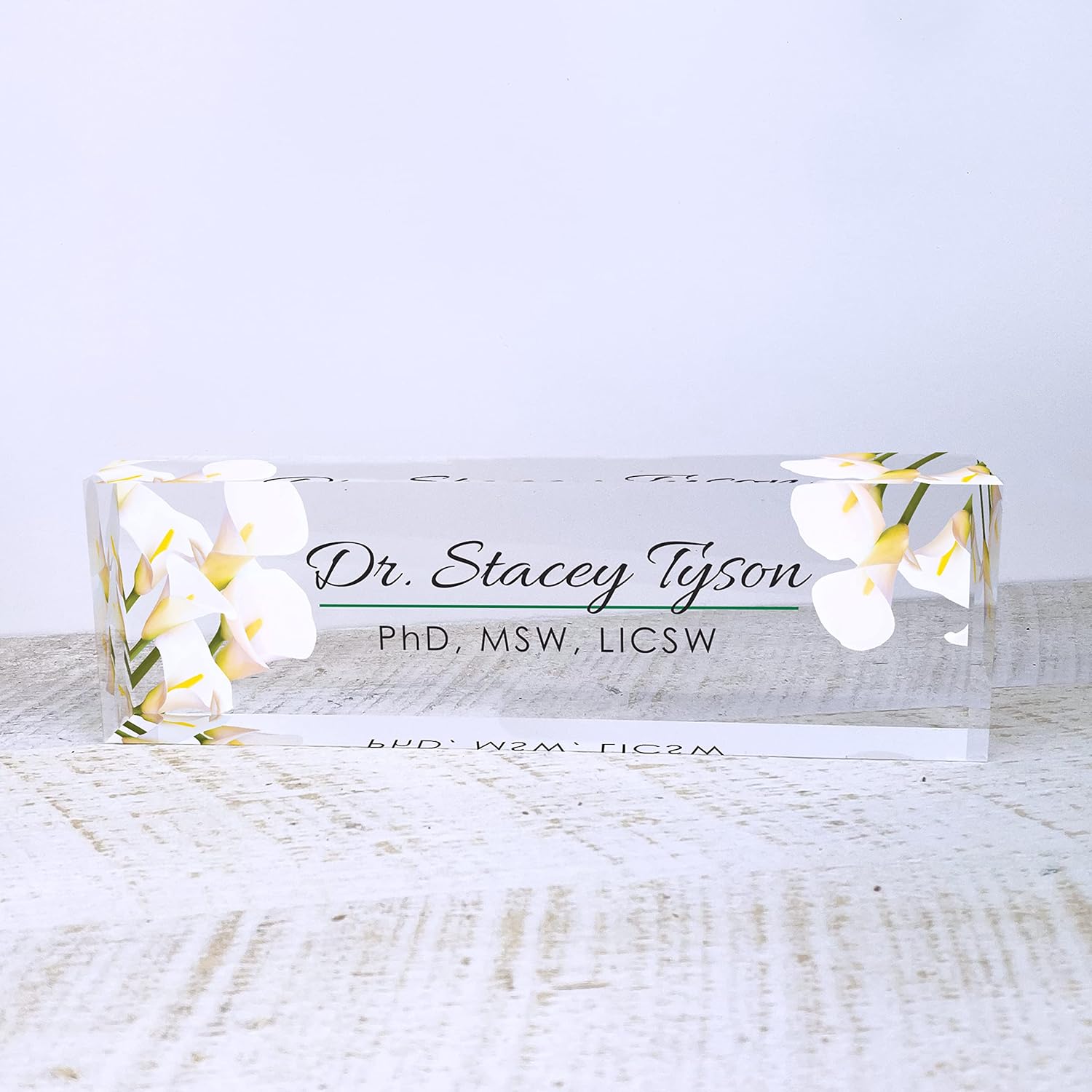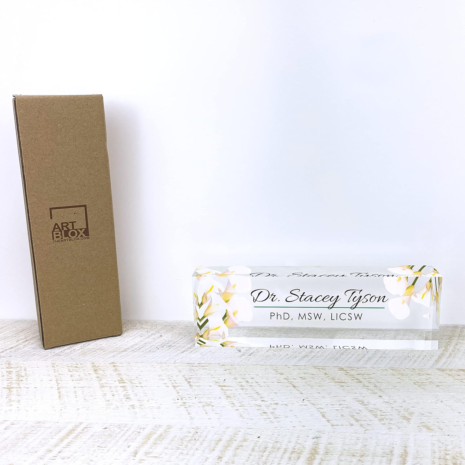 Artblox Office Desk Name Plate Personalized | Custom Name Plates for Desks | Calla Flowers Design On Clear Acrylic Glass | Office Desk Decor - (8" x 2.5")