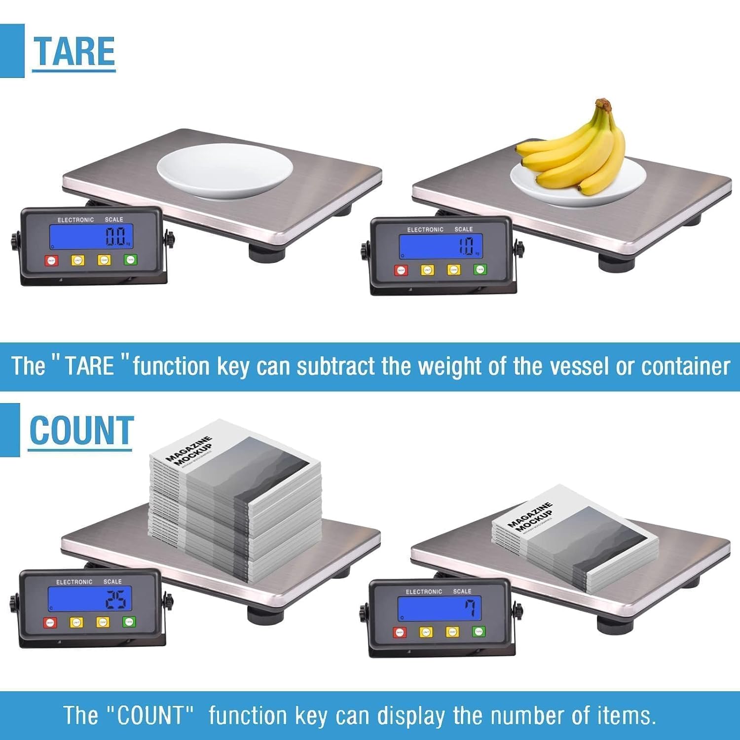 - Tare & Count & Auto-off Function: The tare function of the postal scale allows users to reset the scale to zero after placing a container on the scale. The count function of the package scale allows users to count quantity based on their weight. It can pack, calculate and determine accurately and quickly. The auto-off function can automatically turn off the shipping scale when you do not operate it over 5 minutes powered by batteries, which can make your batteries last longer