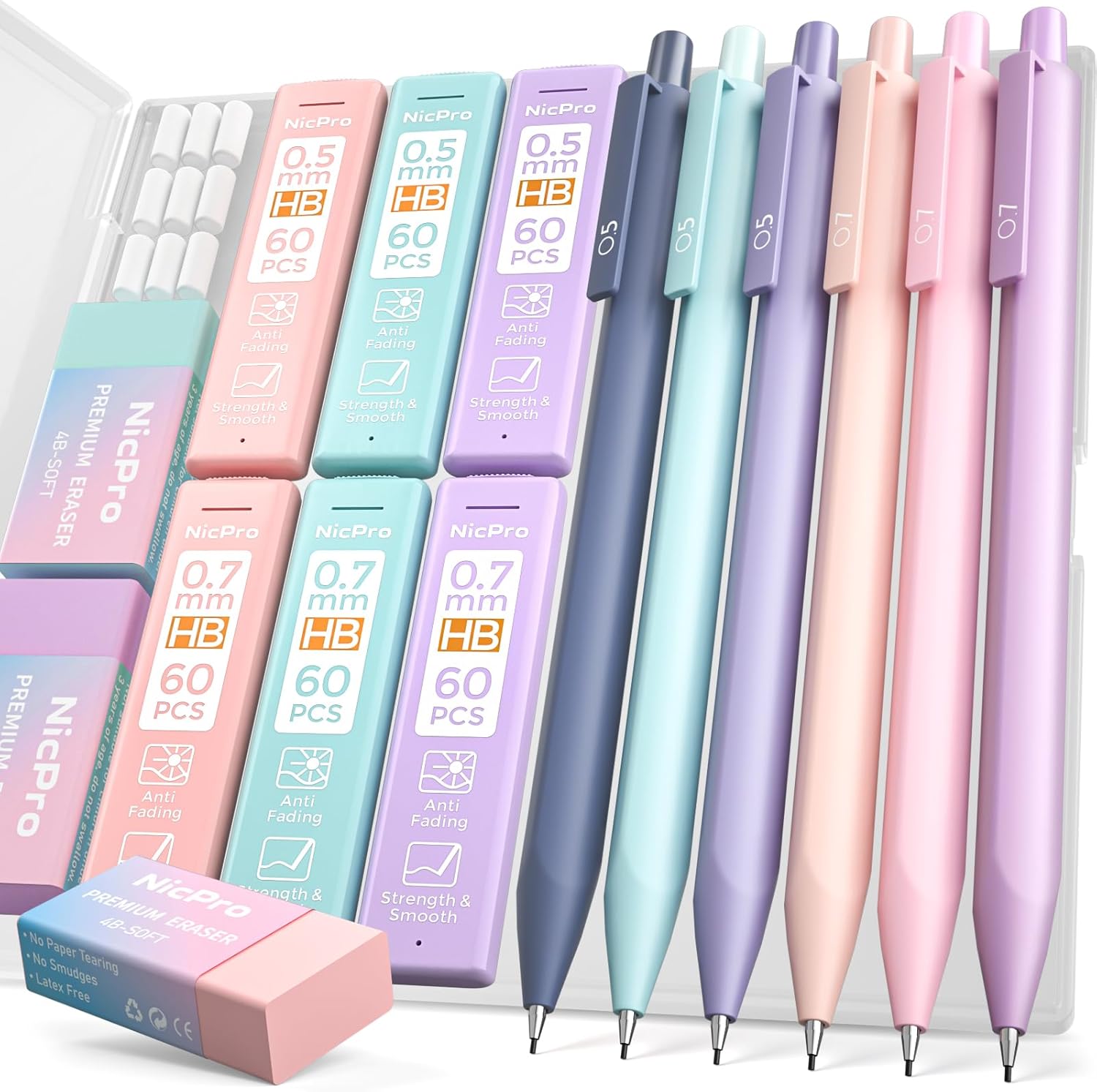 Nicpro 6PCS Pastel Mechanical Pencil Set with Case, Cute Drafting Pencils 0.5mm & 0.7mm with 6 Tubes HB Lead Refills, Erasers, Eraser Refills, Aesthetic School Supplies for Girls Drawing Sketching
