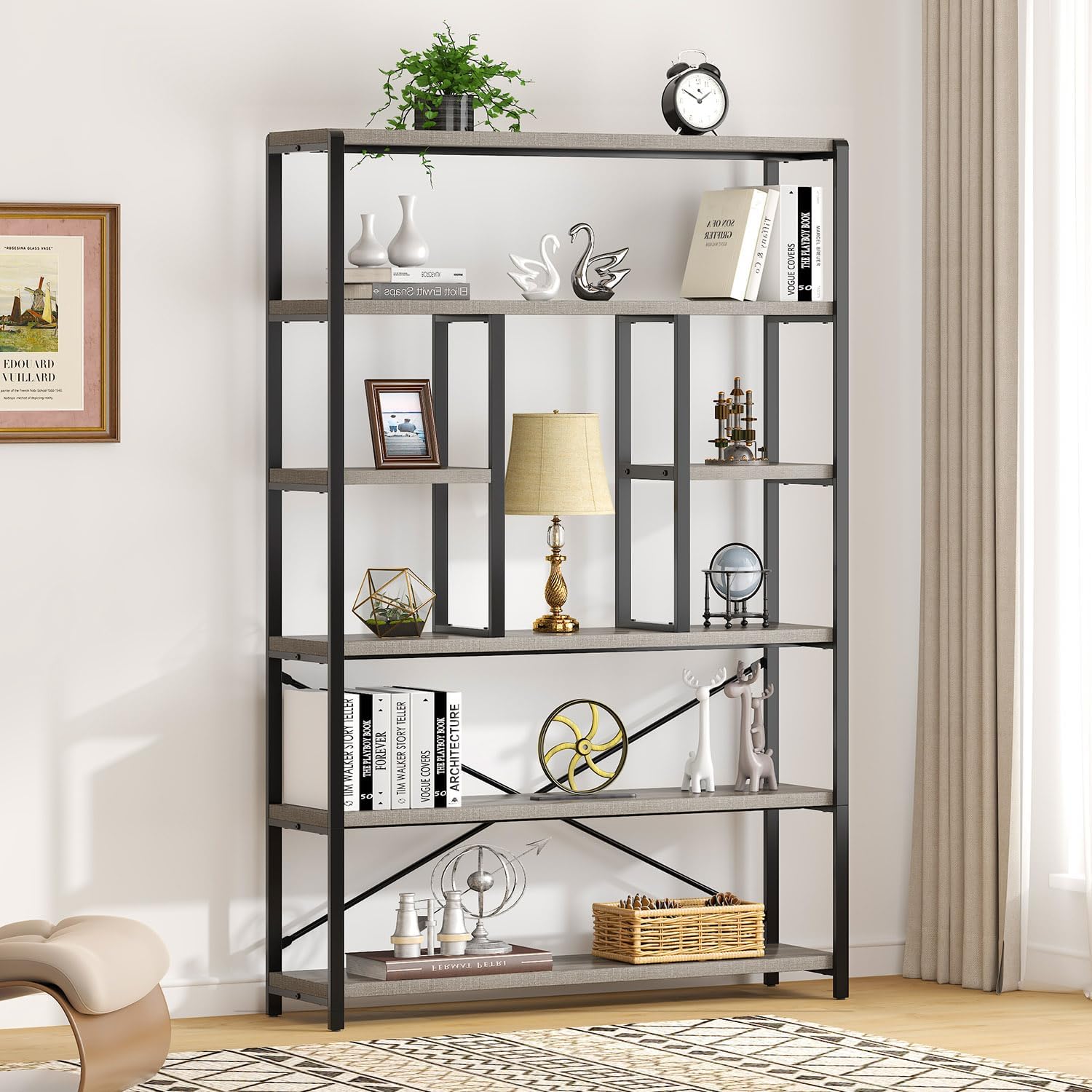 - Industrial-Chic Style: With delicate middle hollow design, rustic oak wood grain and matte black metal frame, the grey big book shelf creates an industrial-inspired style that matches well with your home decor and elevates your home office design to new heights.