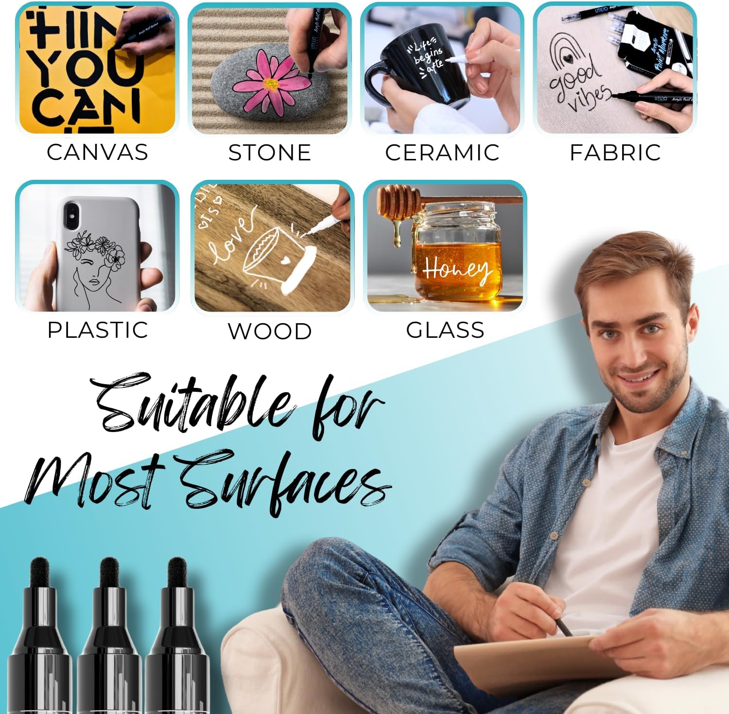 - MULTI-SURFACE APPLICATION: These versatile paint pens are suitable for use on a variety of surfaces, including stone, wood, glass, fabric, plastic, ceramic, metal, rubber and more, allowing you to unleash your creativity on any medium.