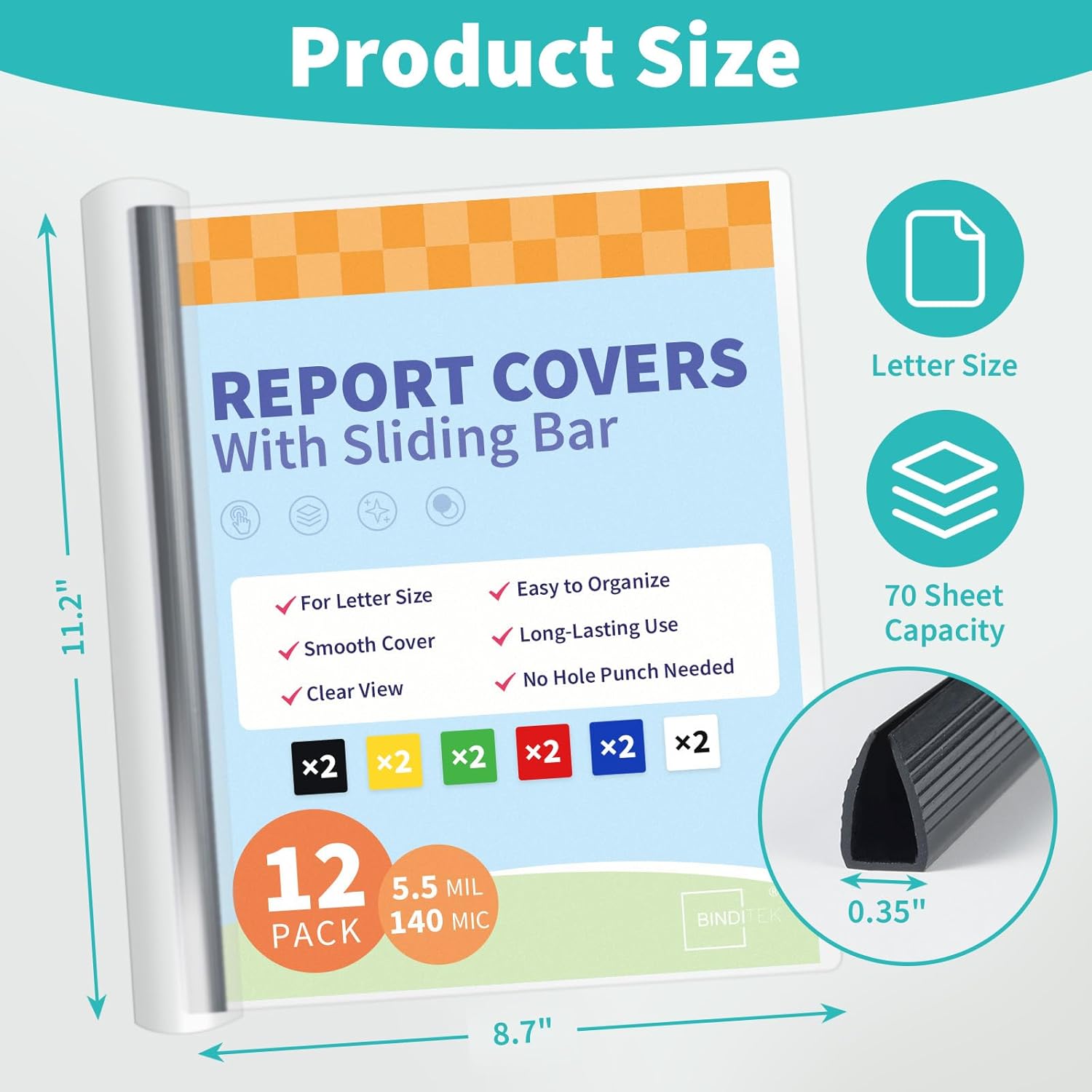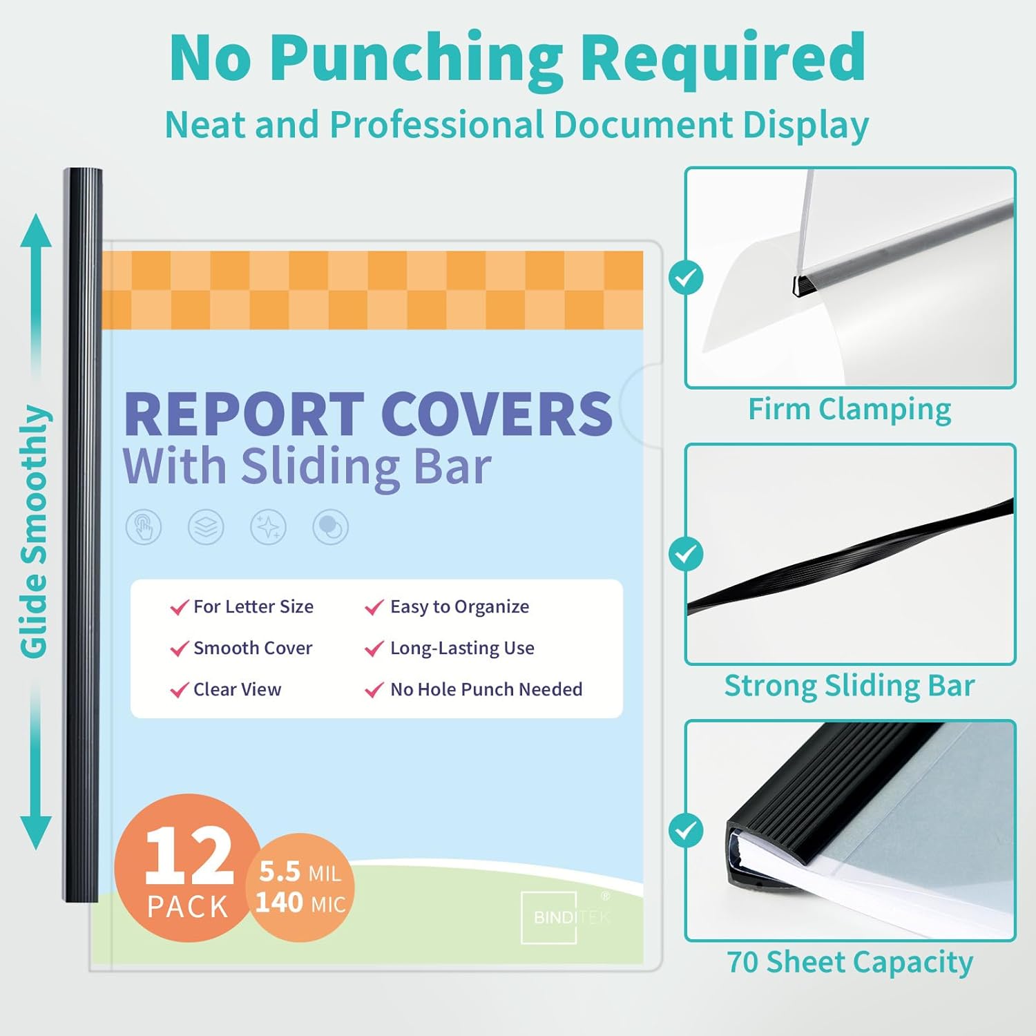 Binditek 12 Pack Clear Report Covers with Sliding Bars, 9mm Sliding Bar File Folder, 70 Sheet Capacity, Letter Size, Multi Color (White, Yellow, Red, Green, Navy, Black), Office Supplies