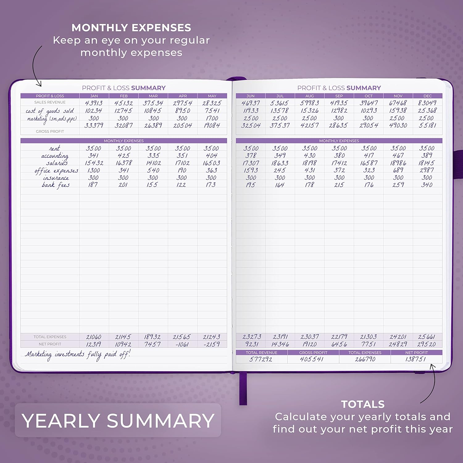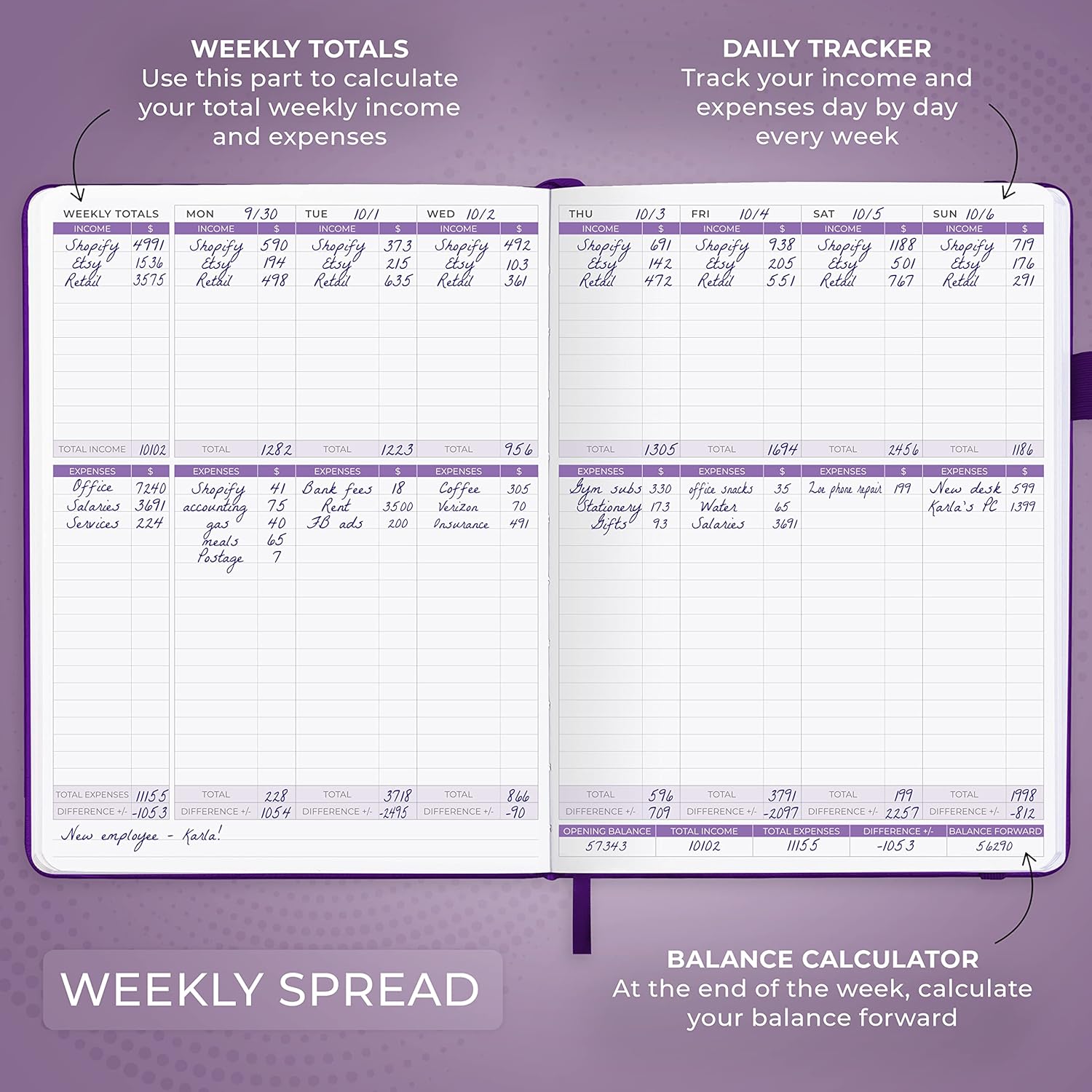 - 2 FULL YEARS OF STRESS-FREE ACCOUNTING: This accounting book is undated and lasts 2 years and has 225 pages, including 106 weekly views, 2 annual summaries, empty note pages, and, at the back, a spacious pocket for receipts.