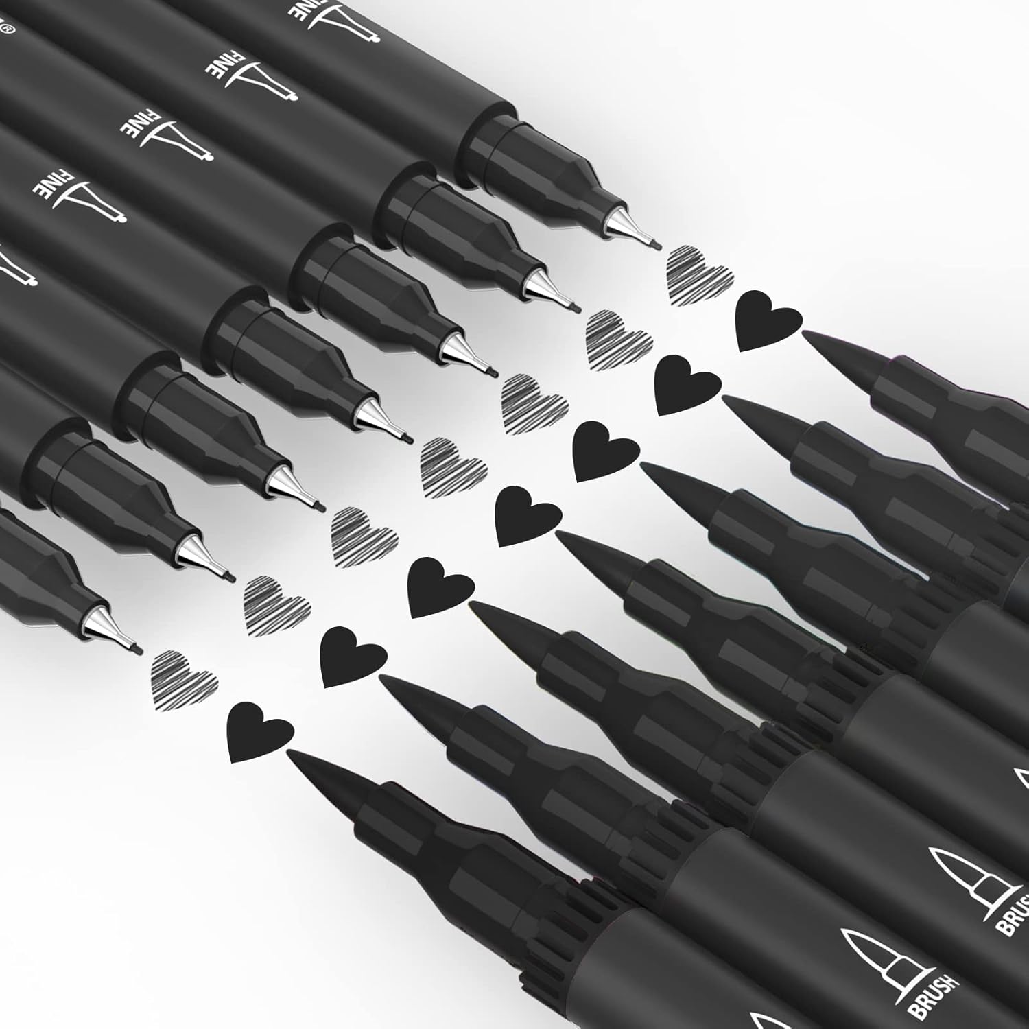 - DUAL TIP DESIGN: Each black marker has a 0.4 mm fine tip and a 1-2 mm brush tip. The fine tip works well for detailing and lettering and the brush tip is suitable for coloring. The combination of the two tips will make your drawing process more efficient and pleasant