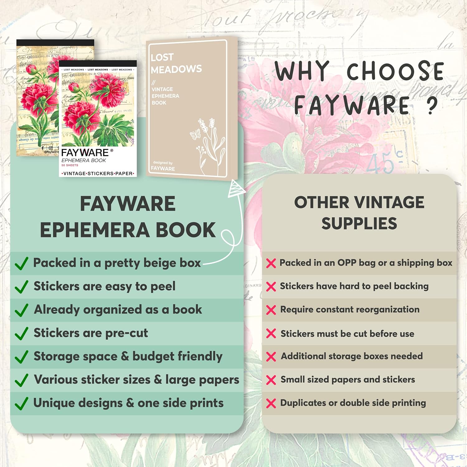 - DESIGNED FOR YOU - FAYWARE ephemera sticker book is a solution for vintage loving scrapbookers that want to spend more time crafting and less time organizing. And for spontaneous journalers that want to journal with convenient & aesthetic supplies whenever inspiration hits, be it in a café or on vacation.