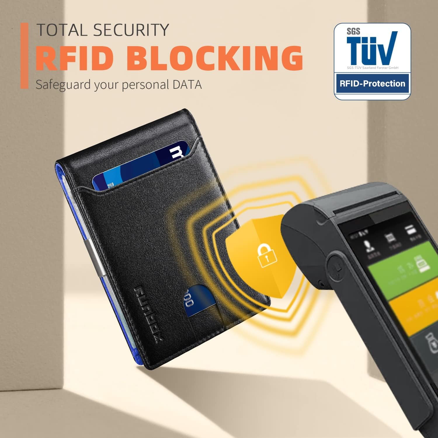 - ππ ππ ππ§ππ’-ππ‘πππ ππππππππ - this slim wallet for men equipped with German Instiute Certified RFID Security technology, a unique metal composite, engineered specifically to block 13.56 MHz or higher RFID signals to protect the valuable information and privacy