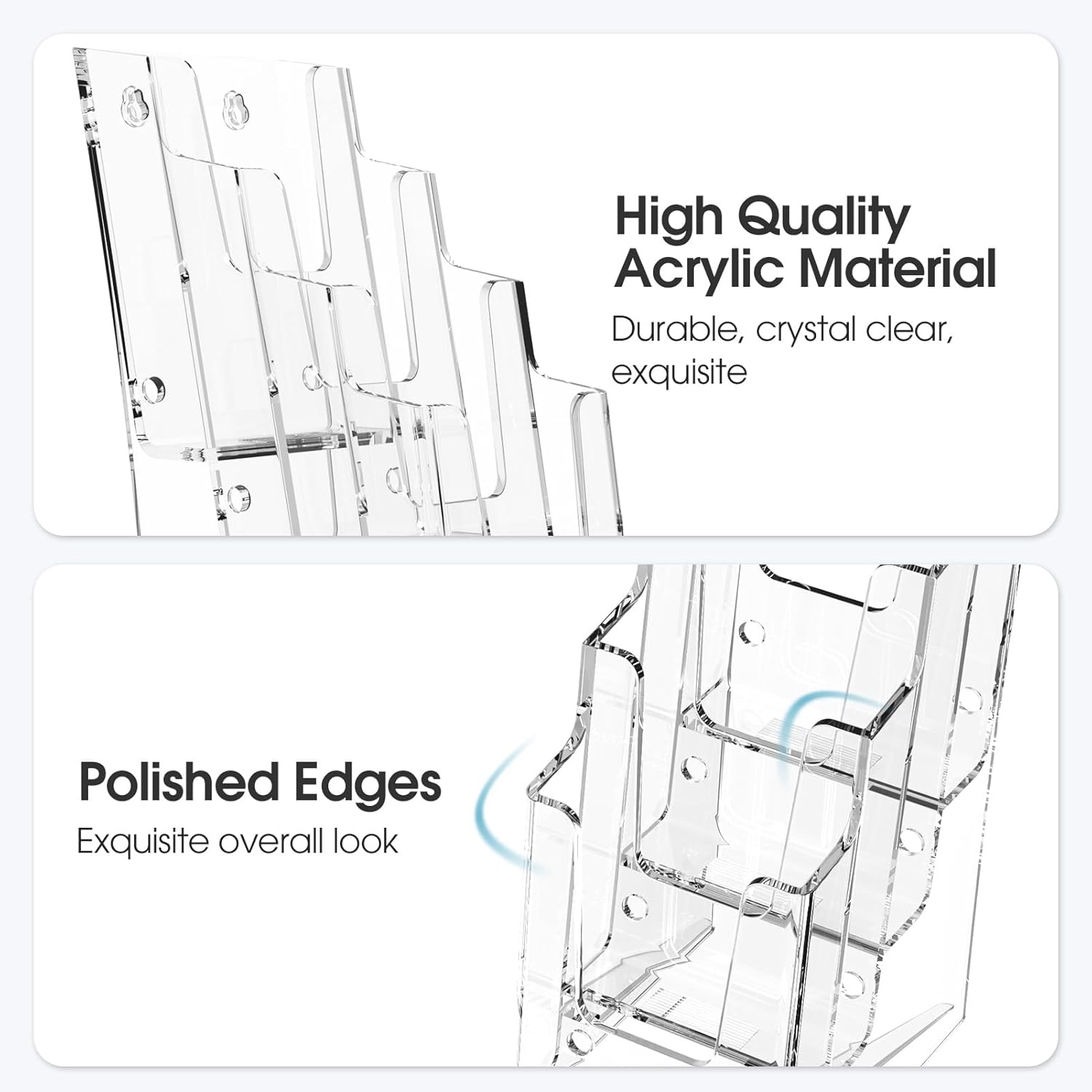 - PREMIUM ACRYLIC MATERIAL: This brochure holder is made of premium-quality clear acrylic plastic. Acrylic is as clear as real glass, it has more advantages than glass like impact, scratch and weather resistant. So that it is more sturdy and durable