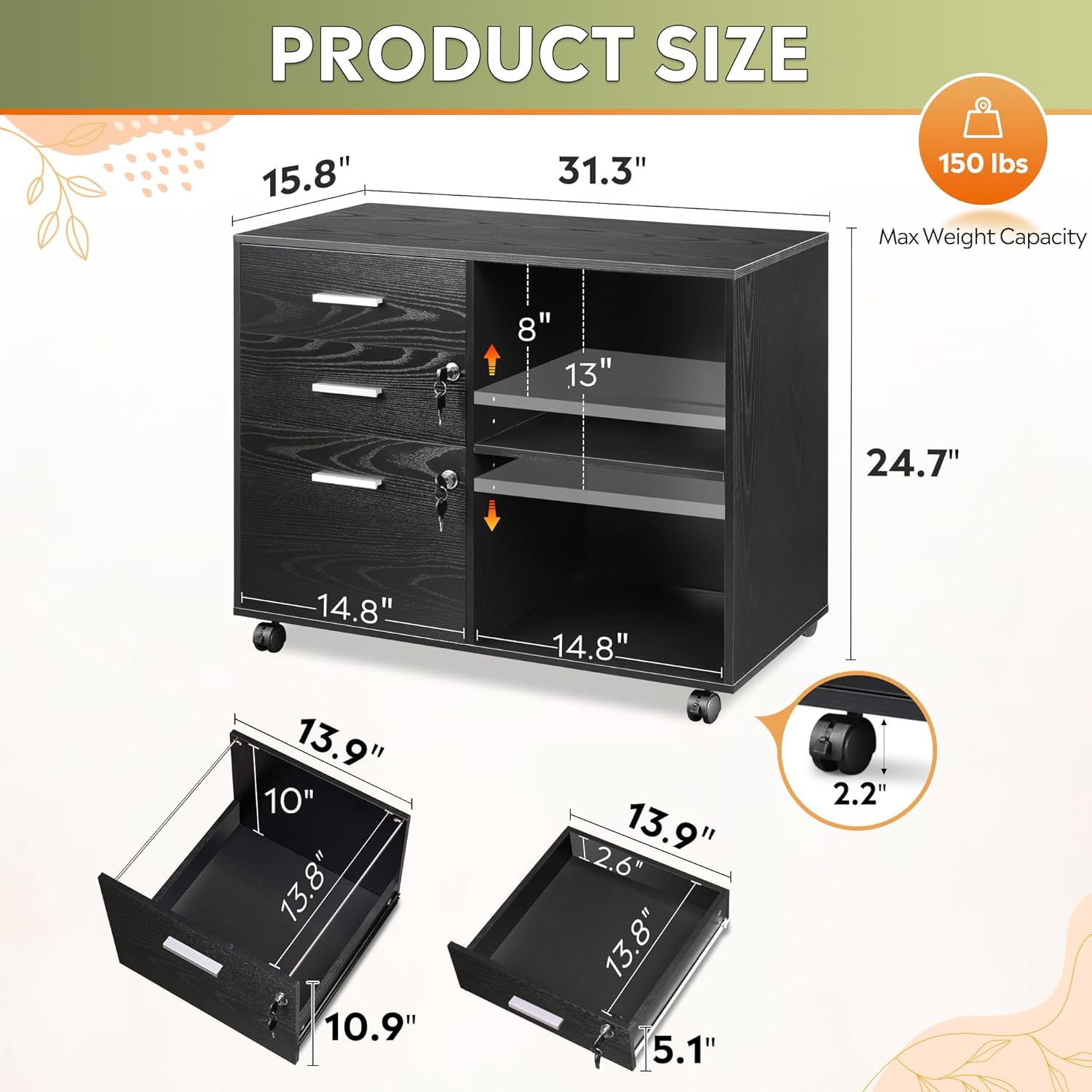 - Easy Mobility: The wooden file cabinet is equipped with 5 rolling wheels, allowing it to be easily moved and positioned beside or under desk. The front 2 wheels have built-in brakes and the bottom center is equipped with anti-tip casters to keep the cabinet stable.